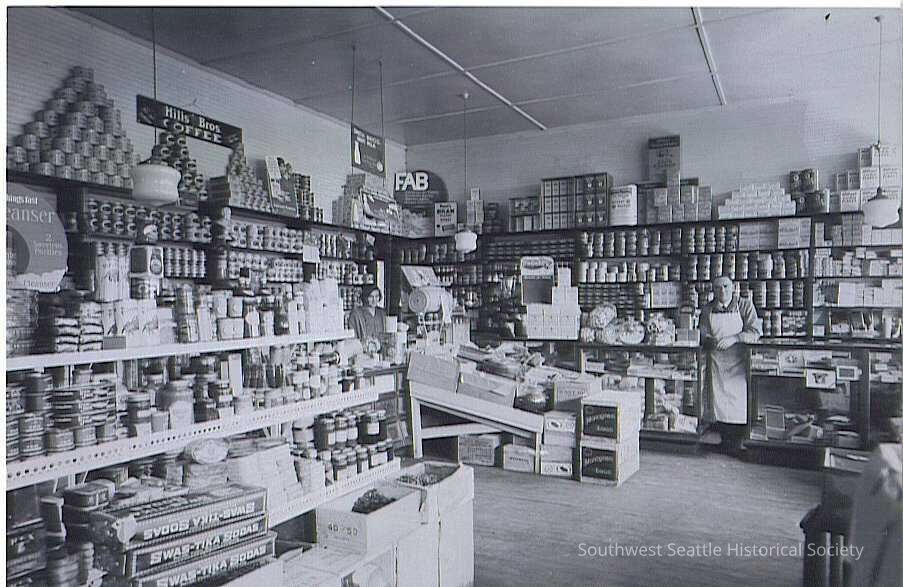 BW photo - interior of J. Budinich Grocery, which was located in Riverside, Mr. Budinich behind counter