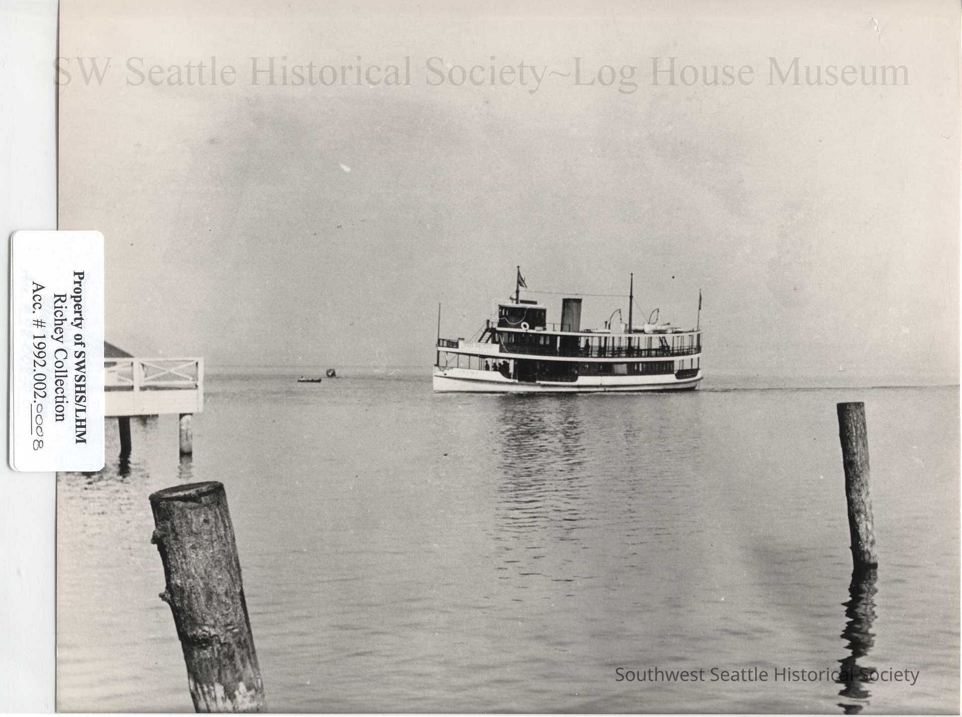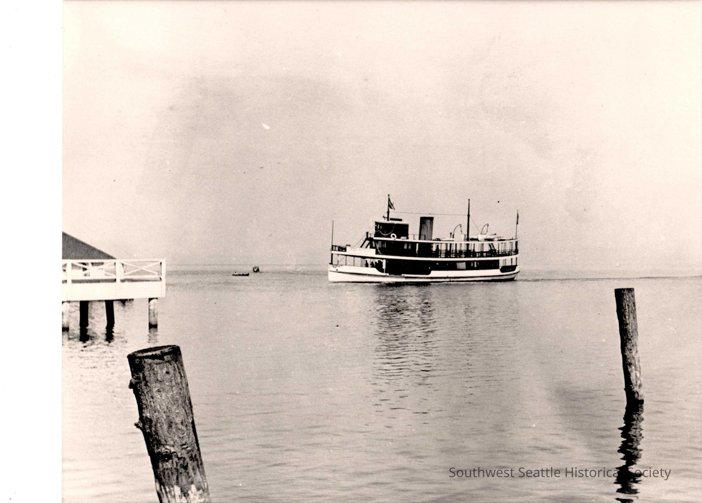 Steamboat at Alki landing, dock located on 63rd. Dock had indoor swimming pool on it, burned later. Undated. Black and white photo