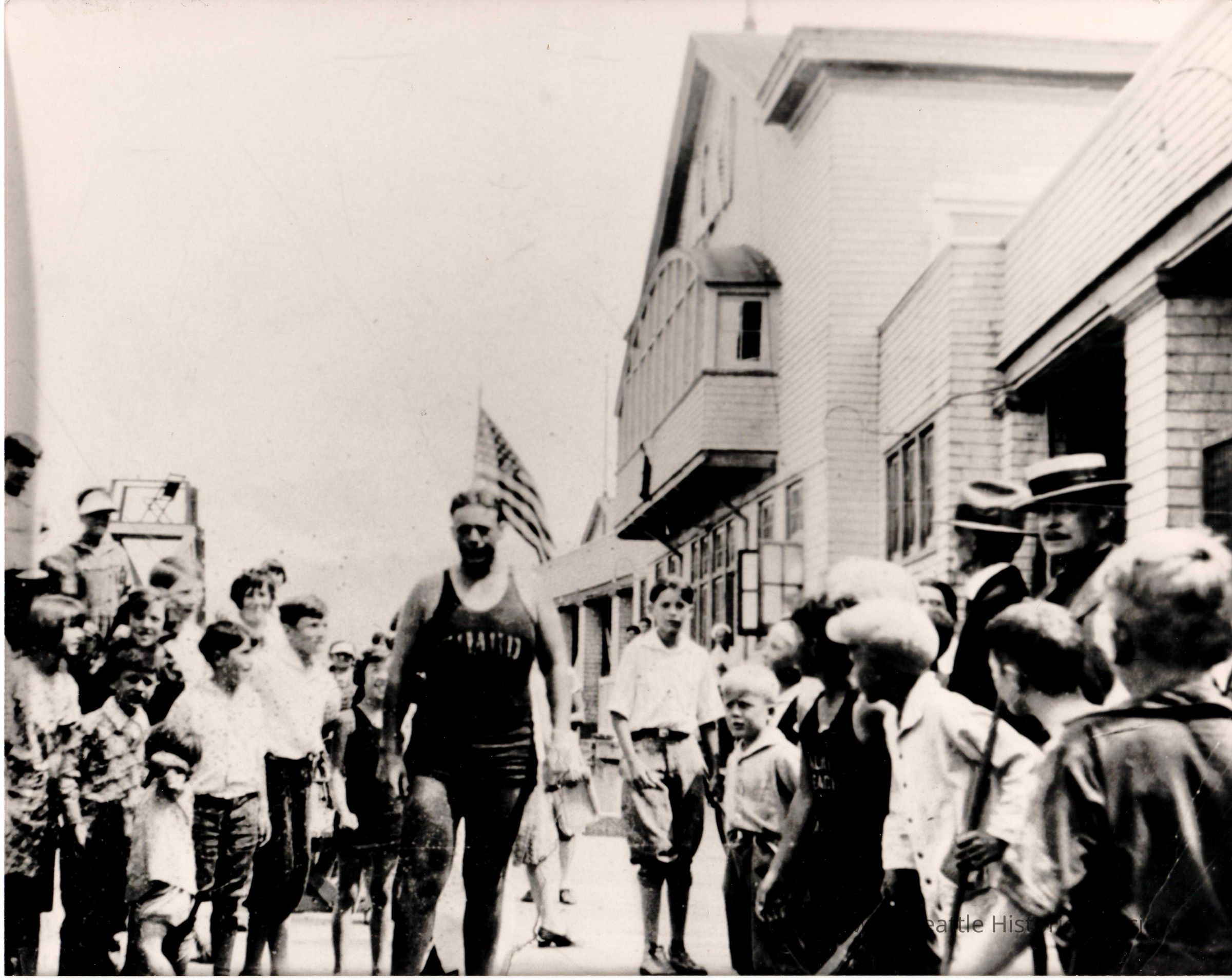 Lifeguard posing with crowd, building on right, possibly the bathhouse, U.S. flag behind him. Black and white photo.