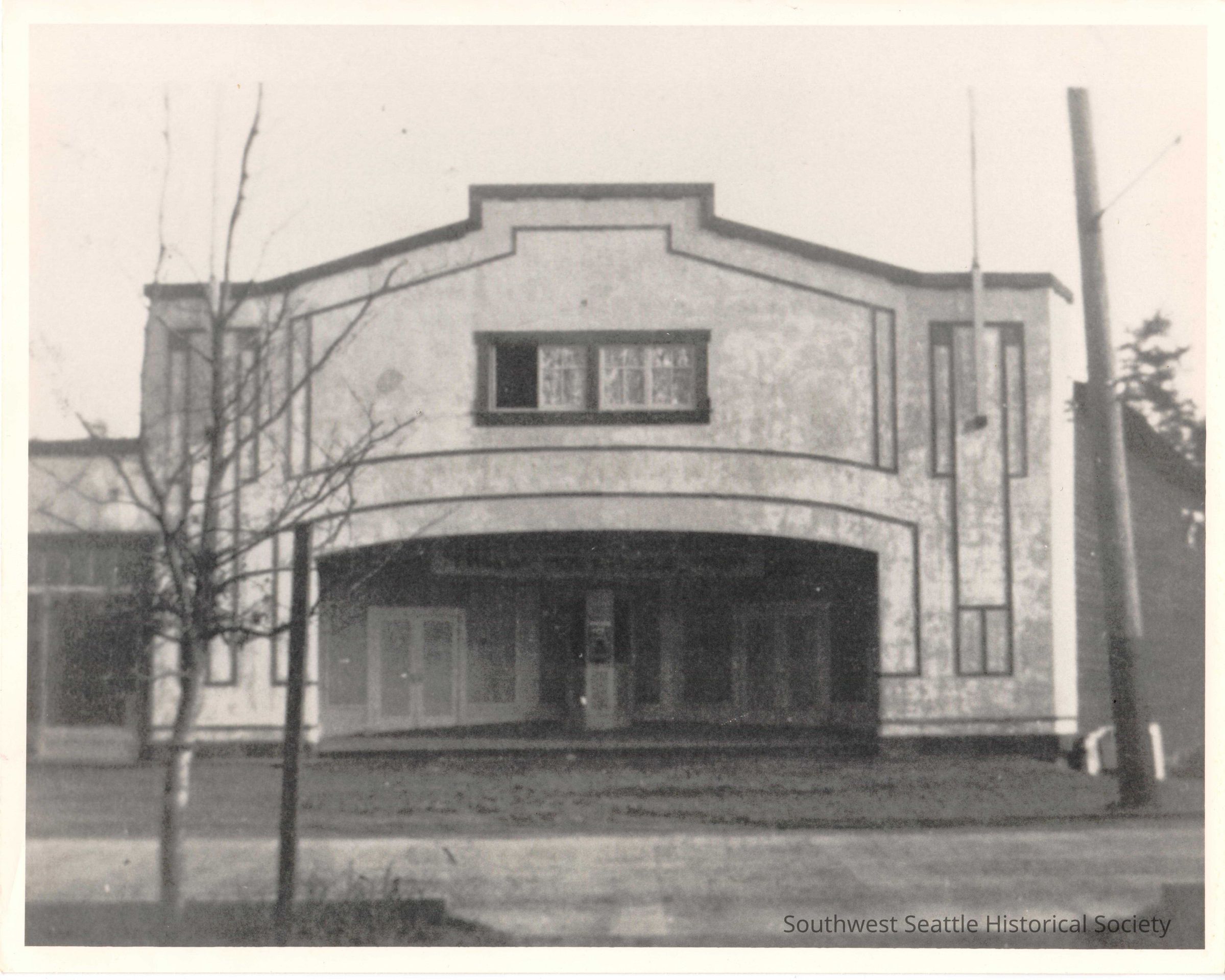 Alki Theatre in 1913, "A feature every show". Later became a garage, first Rodger Manning, then Al Turner owned it. Black and white photo.