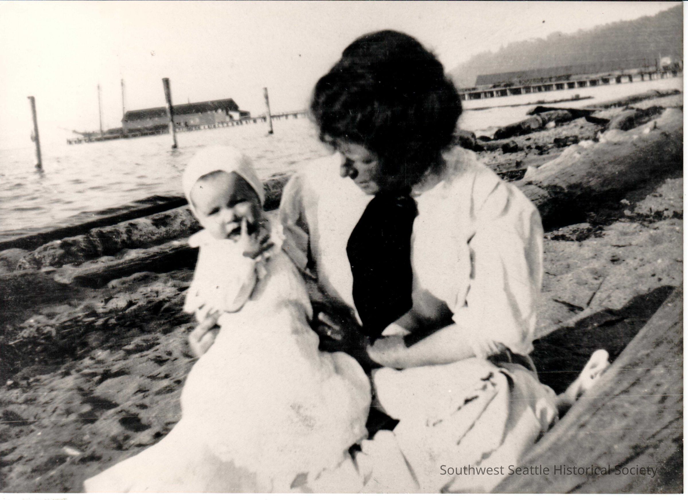 Woman with infant at Alki Beach.Entry/Object ID