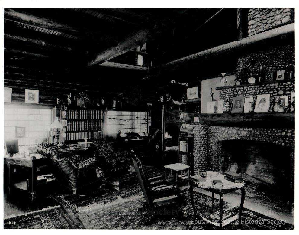 BW Photo Negative Interior of Fir Lodge. Large stone fireplace with pictures on mantel. Several chairs around room, one leather. Bookcase filled with books, left side of room. Floor covered in ornate rugs. You can see part of the second floor.Relationships