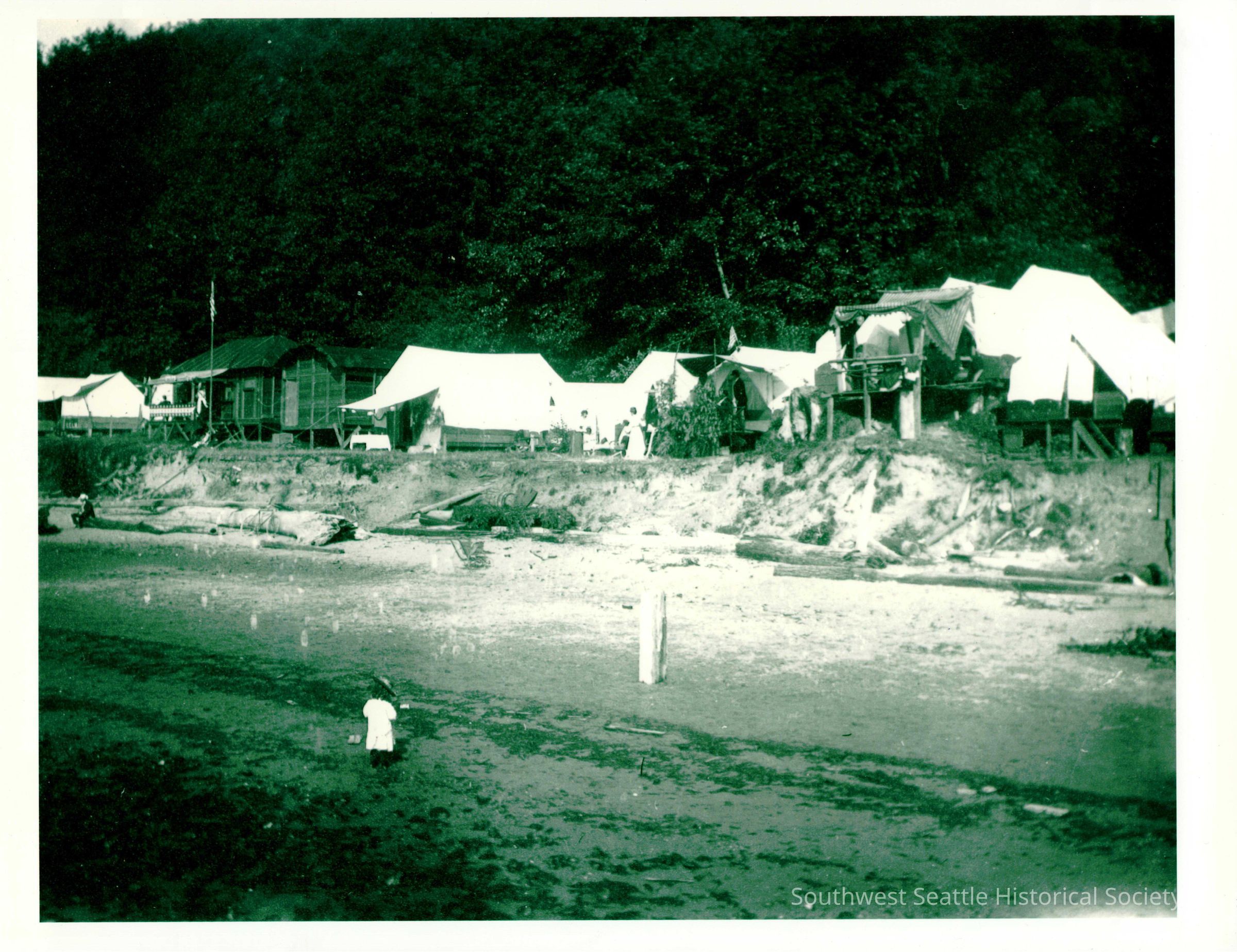 Tent houses at Alki Beach, view from water. Two flag poles with American flags. Girl in white dress in water near the beach. Group of women in front of tent houses.