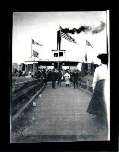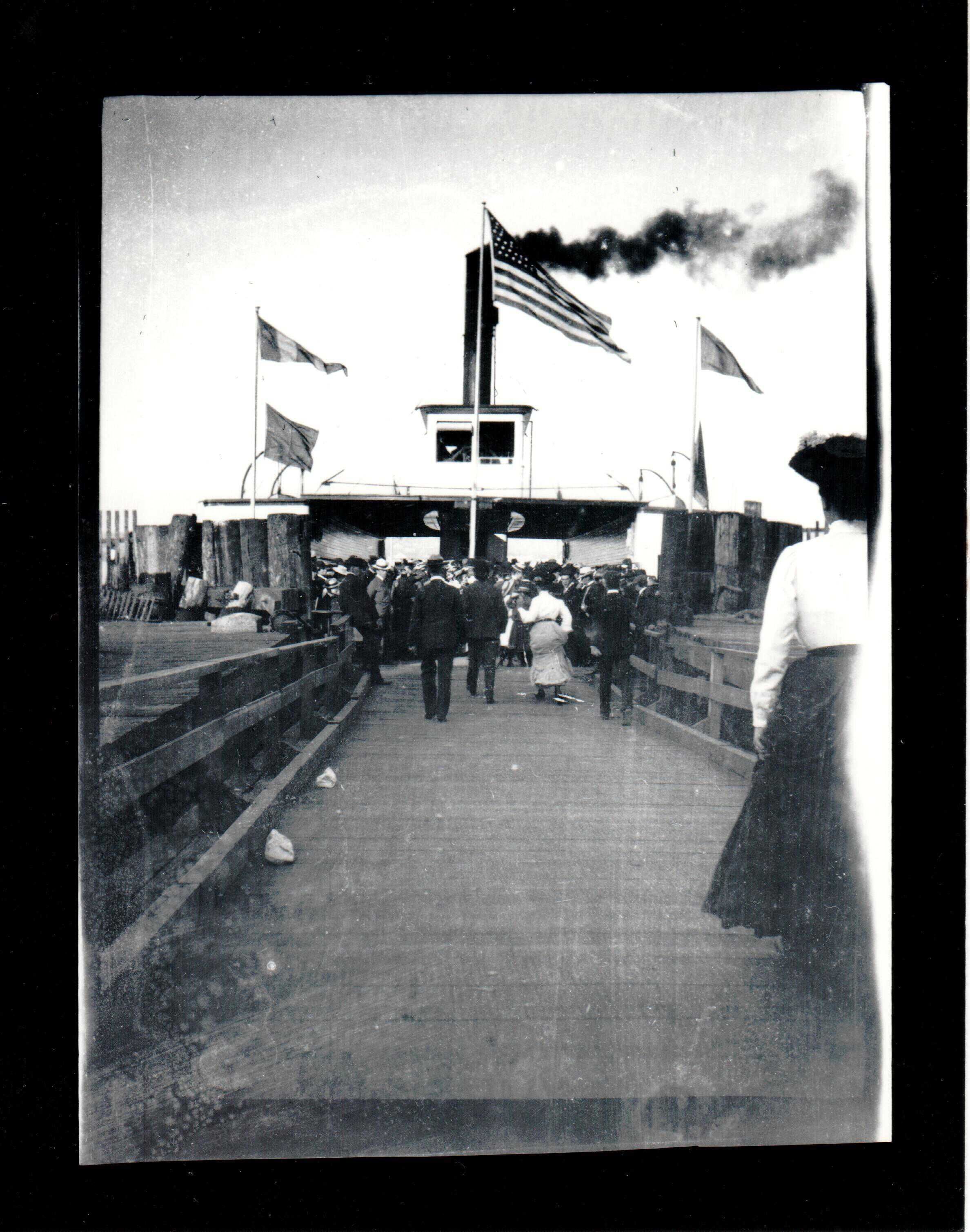 Ferry at West Seattle pier. Large crowd of people waiting on pier. Flag pole with American flag, in front of ferry.Collection