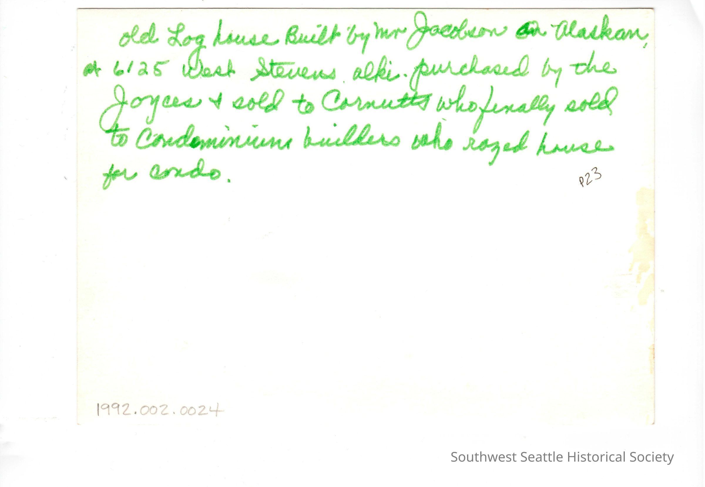 Alki, log house built by Mr. Jacobsen.Entry/Object ID