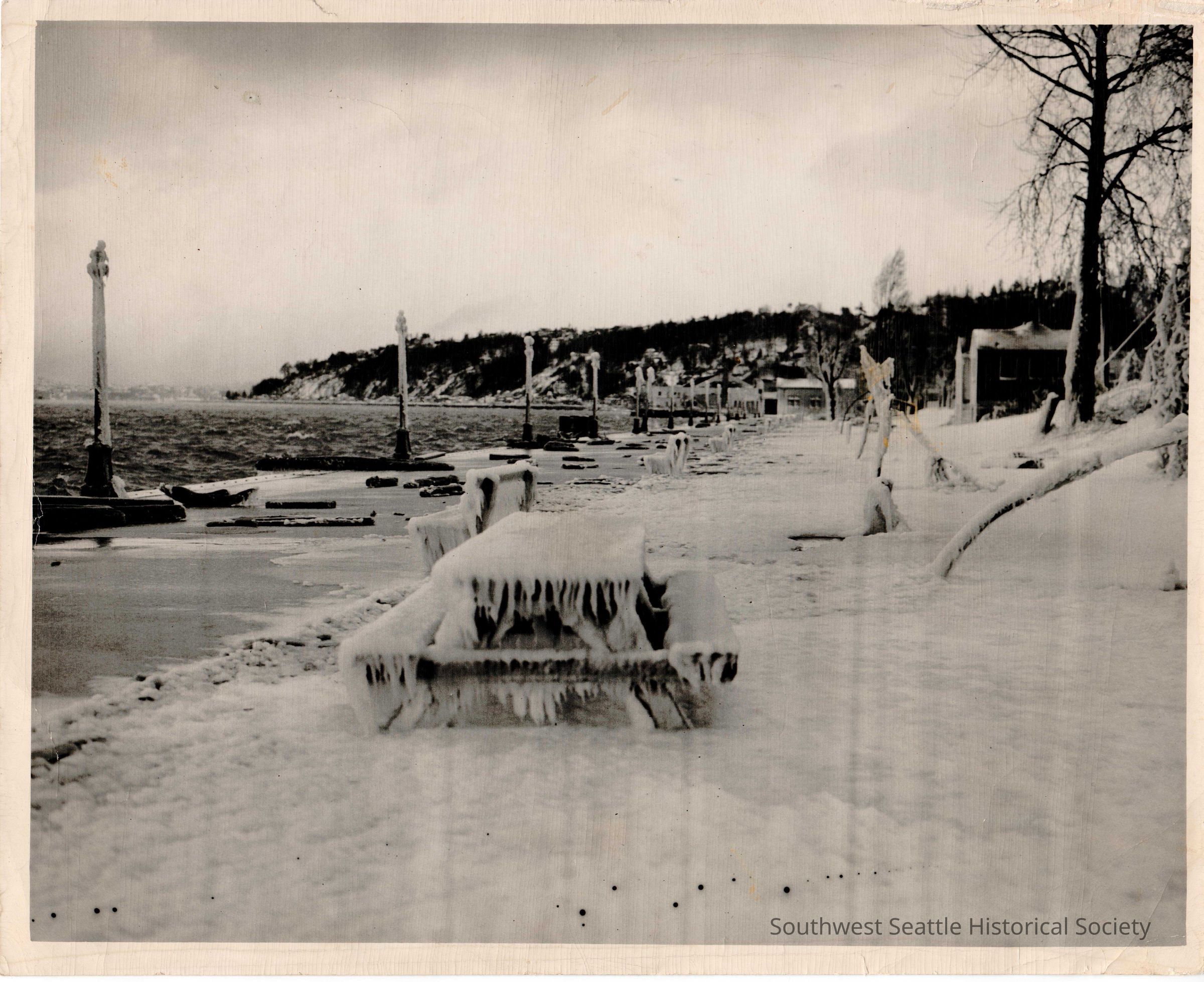 Ice and spray frozen along Alki bulkhead at 3022 Alki Avenue. Undated. B&W photo.Collection