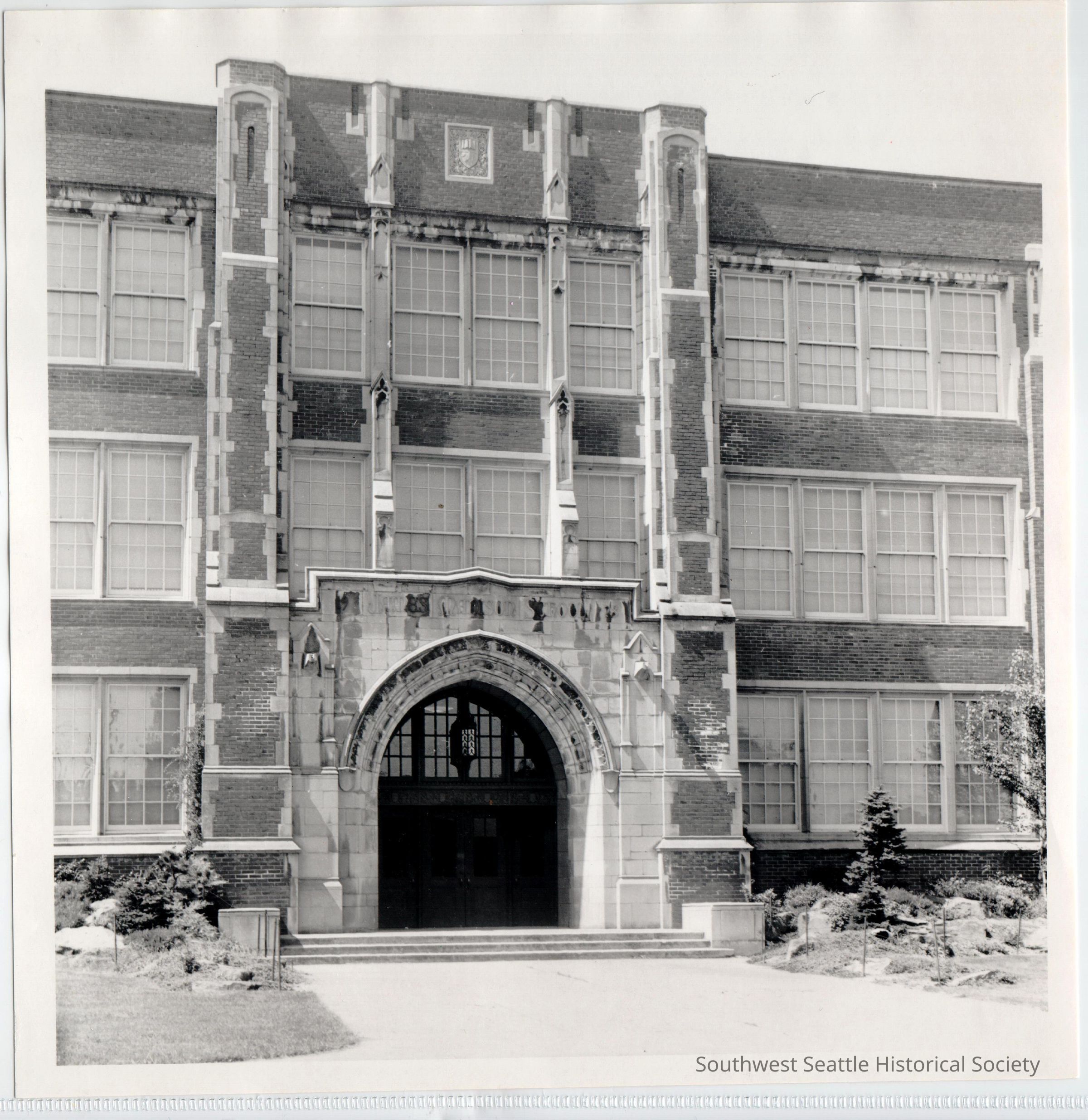 Black and White. Front view of Madison Middle School. Opened in 1929, it is still being used as a school. James Madison School can faintly be seen above entrance to school.