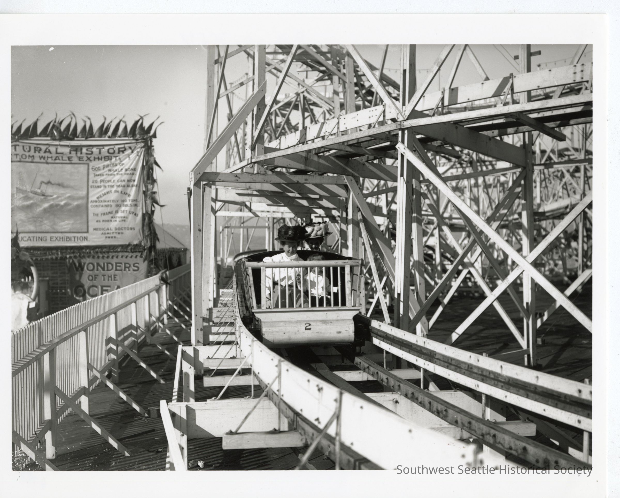 Two women and a child ride 'The Great Figure Eight' roller coaster at Luna Park.Collection
