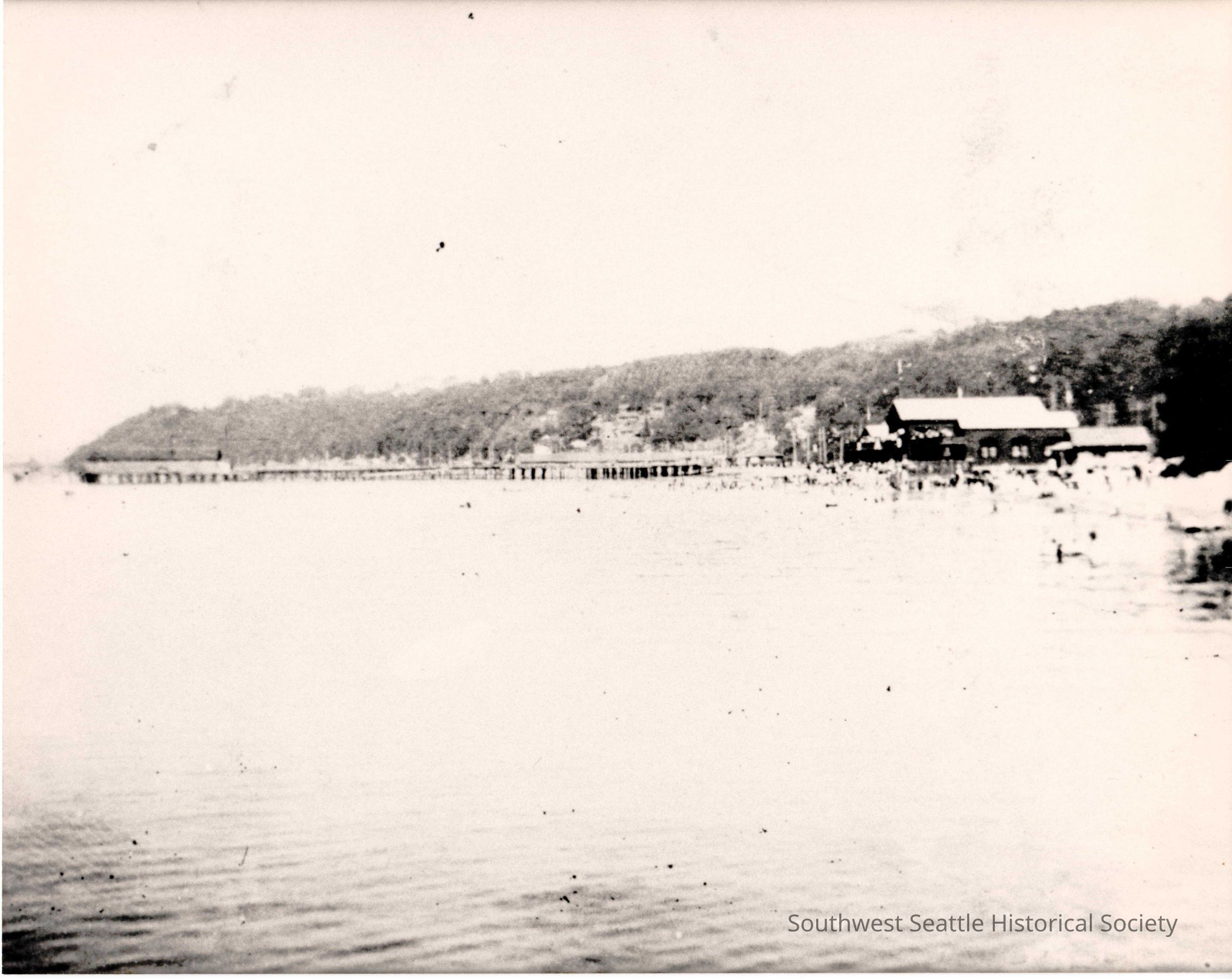 View from water of Alki Bath house and piers beyond, black and white photo.
