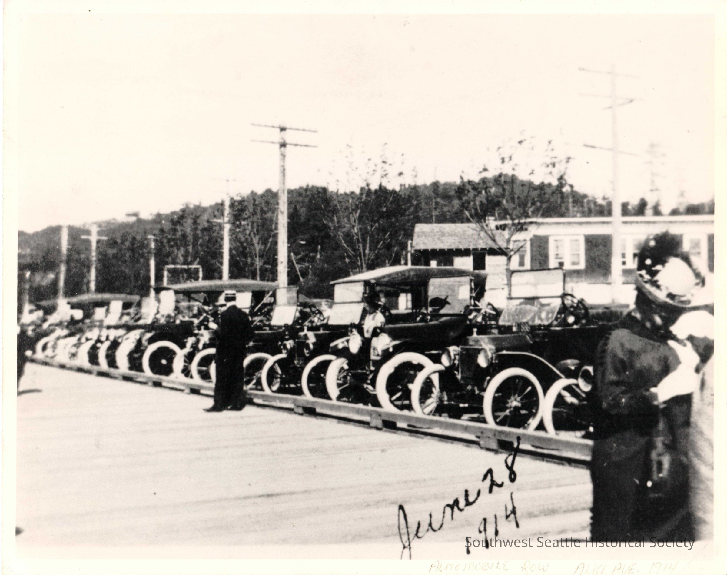 Automobiles parked in a row on Alki Avenue (many are Ford Model T's). Automobile row, Alki Beach 1914. The Fir Lodge/Alki Homestead Restaurant was the Seattle Auto Club at the time.Collection