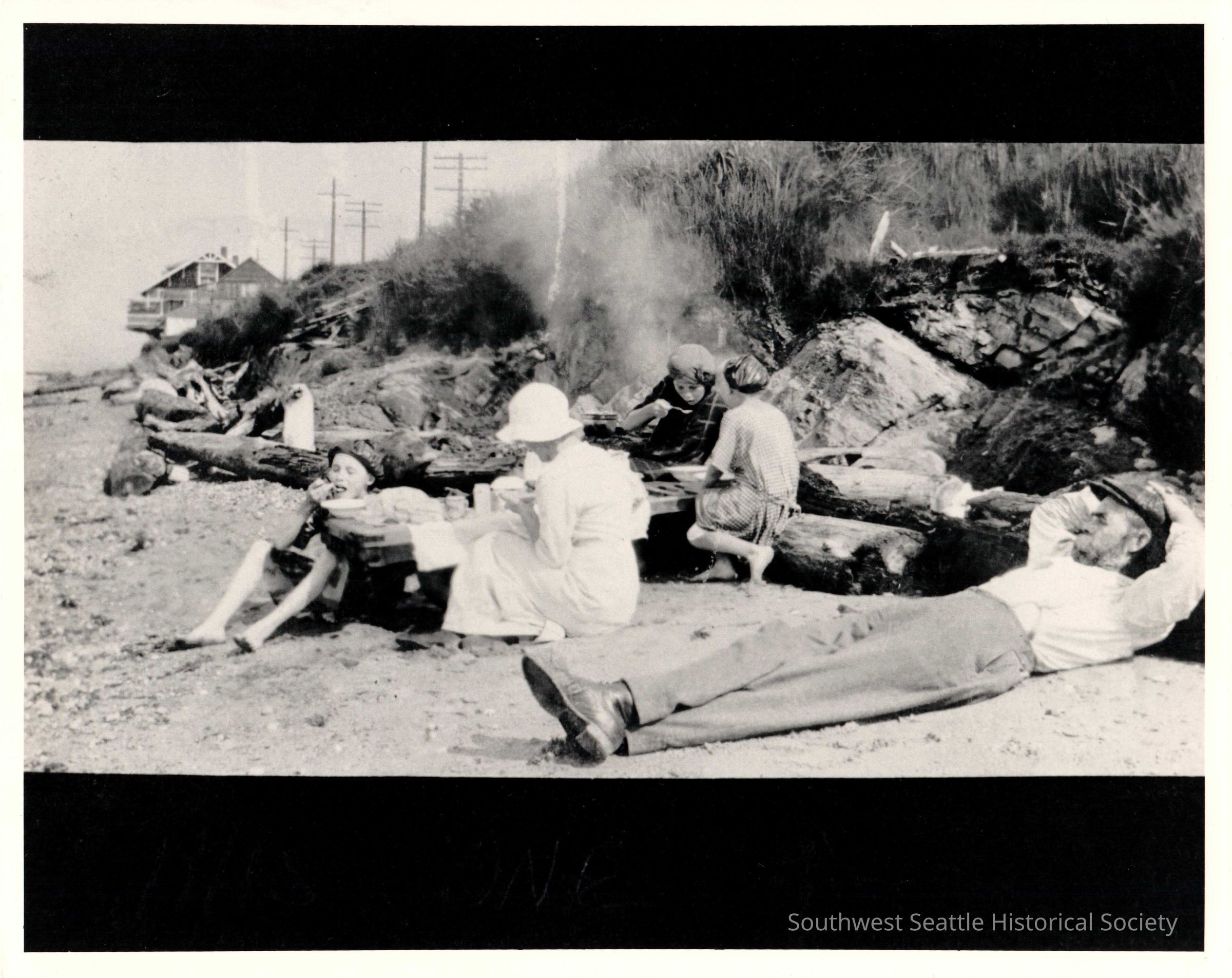 Family picnic on 4200 Beach Drive, where the bulkhead and stairs are currently. Dozing bearded man, woman in light dress and cap, three children eating from bowls. Smoke in background on beach. Homes visible in distance.Collection