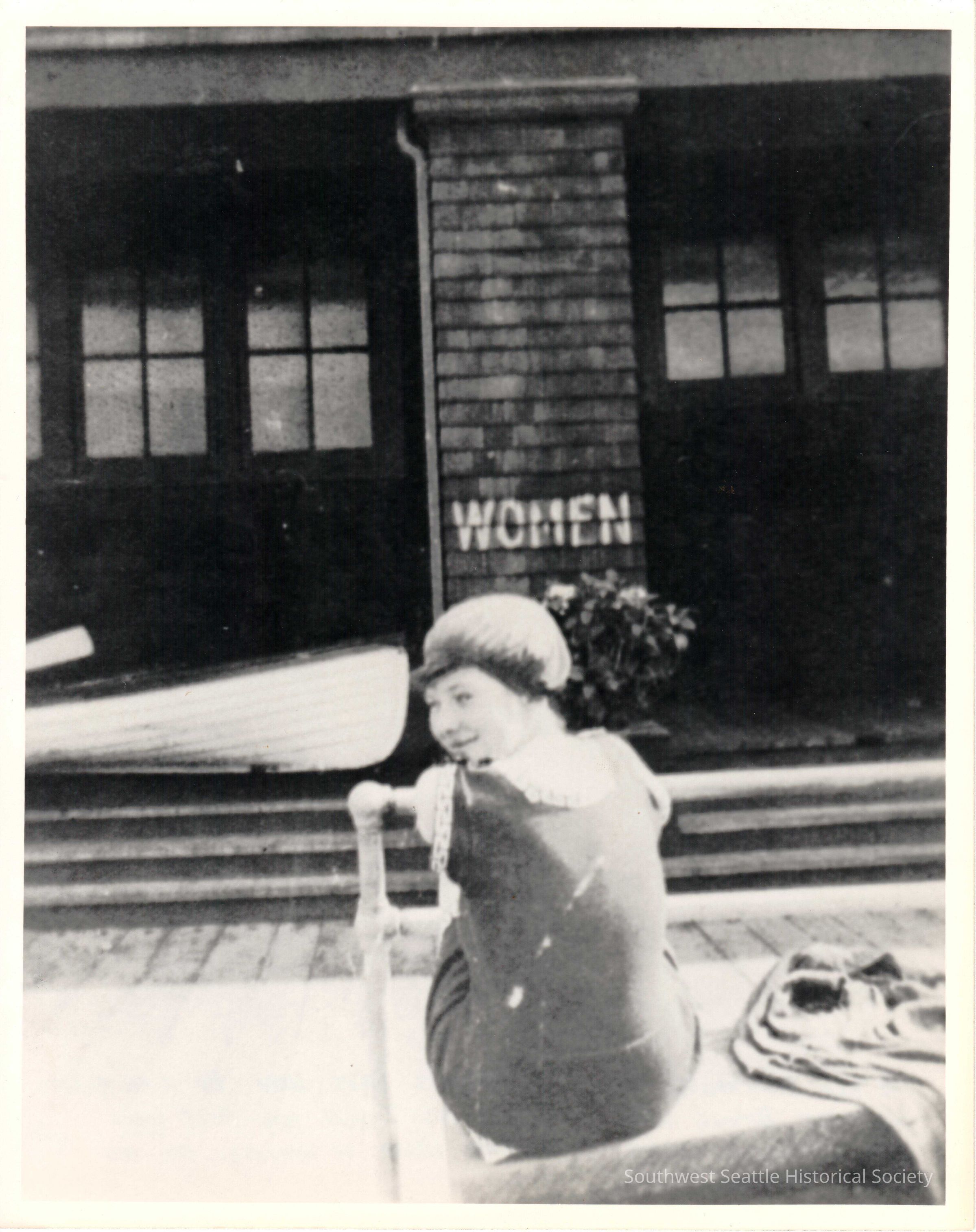 Bathhouse in 1900's. Visible is entrance to women's room, lifeboats, and female swimmer in wool suit and cap.