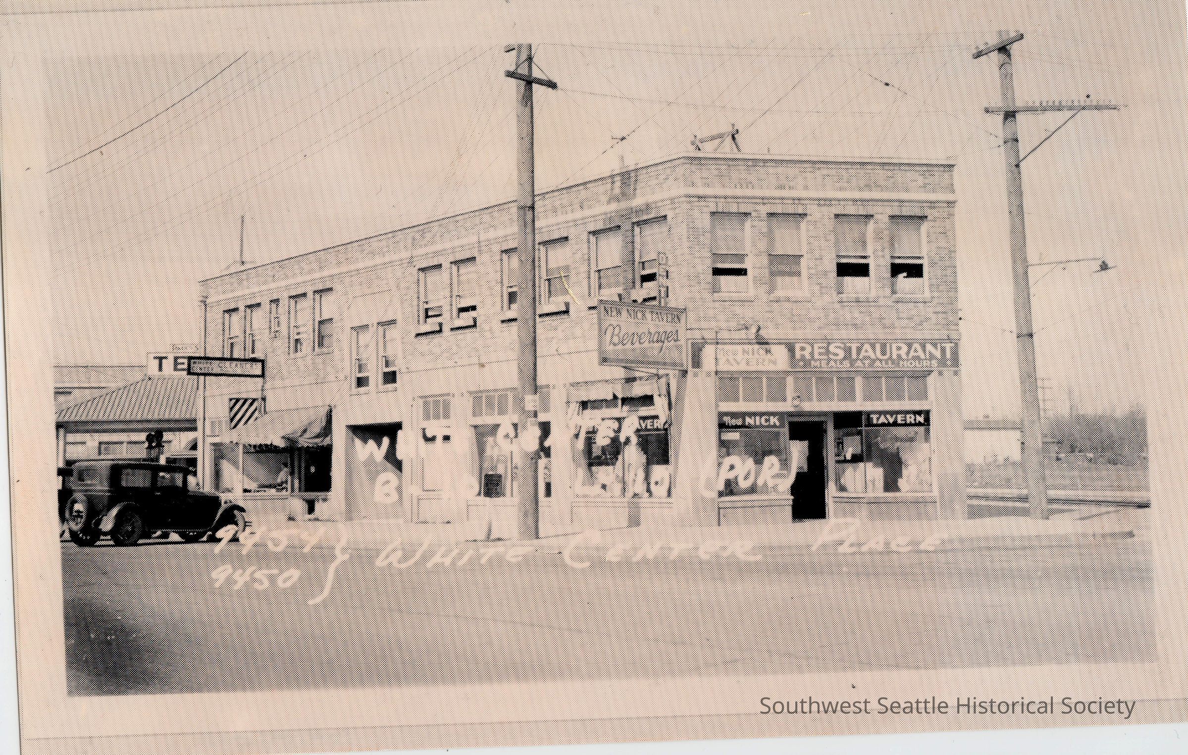 Black and White. Businesses at White Center Place. New Nick Tavern, and White Center Cleaners can be seen. Black car is parked at the side of the building. Exact address is given on front of photo.