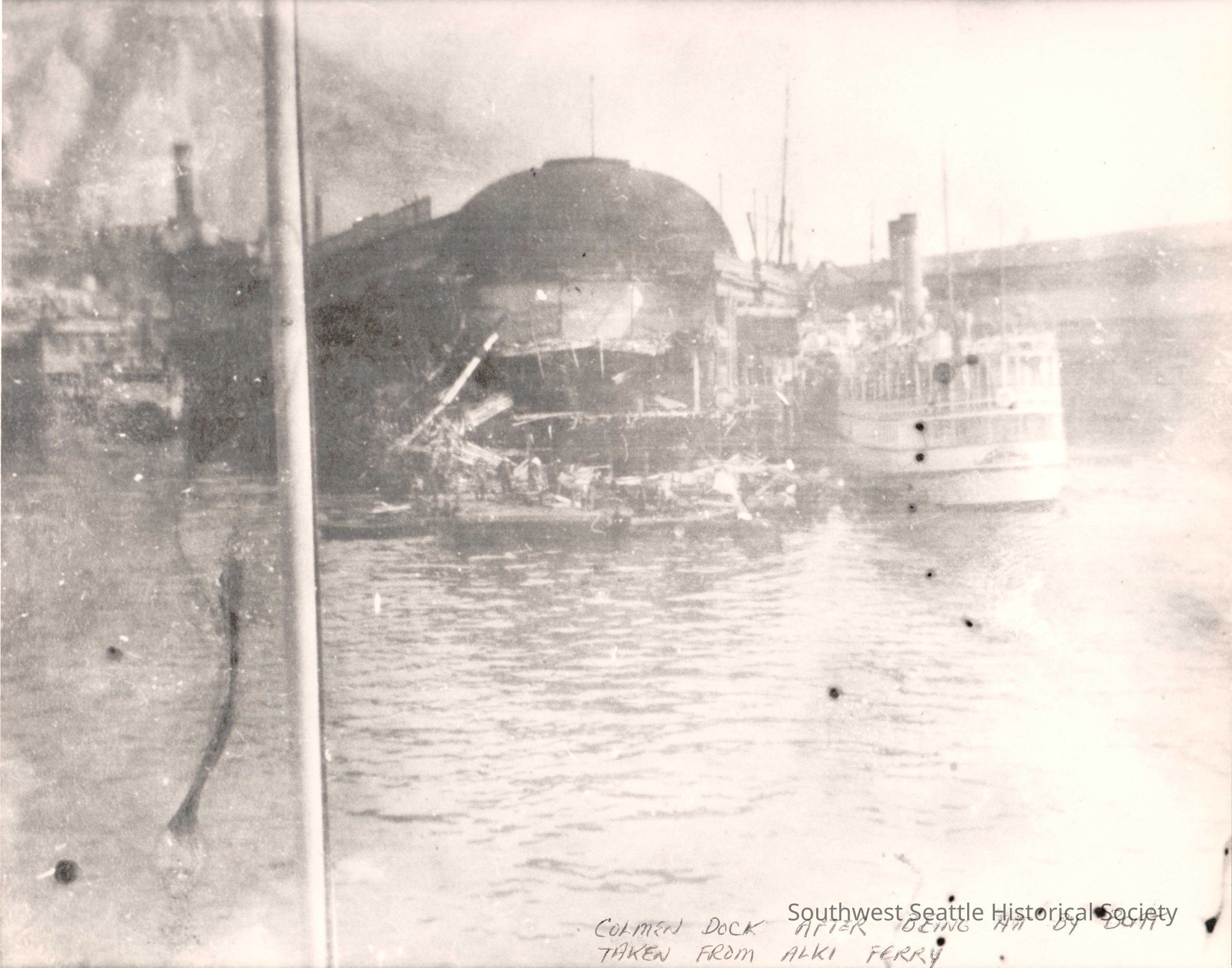 Colman Dock after being hit by the Alameda, 1912.Entry/Object ID