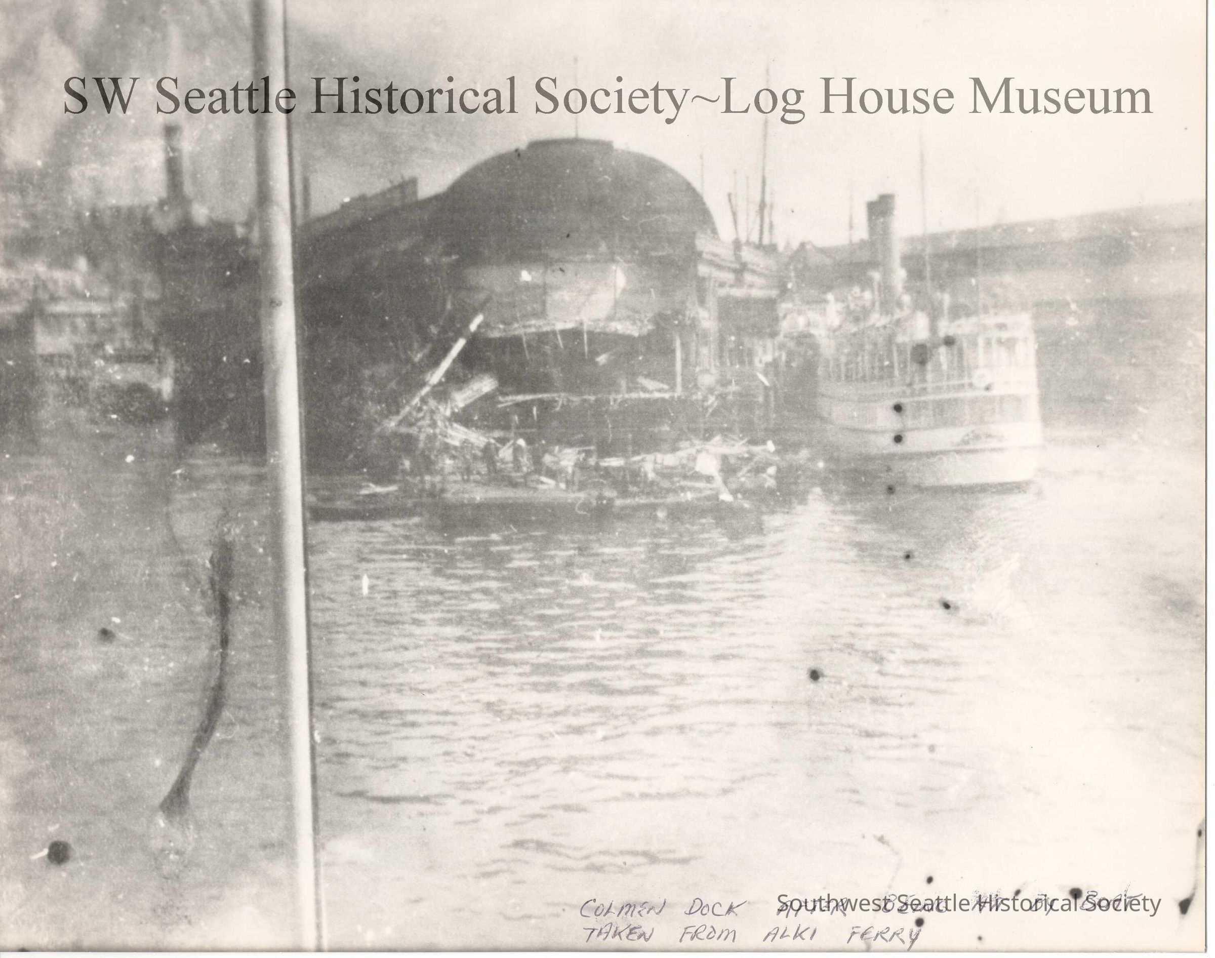 Black and white. Colman dock as viewed from the West Seattle Ferry after being hit by the steel-hulled Alameda. Boat: H.B. Kennedy of Bremerton visible.Collection