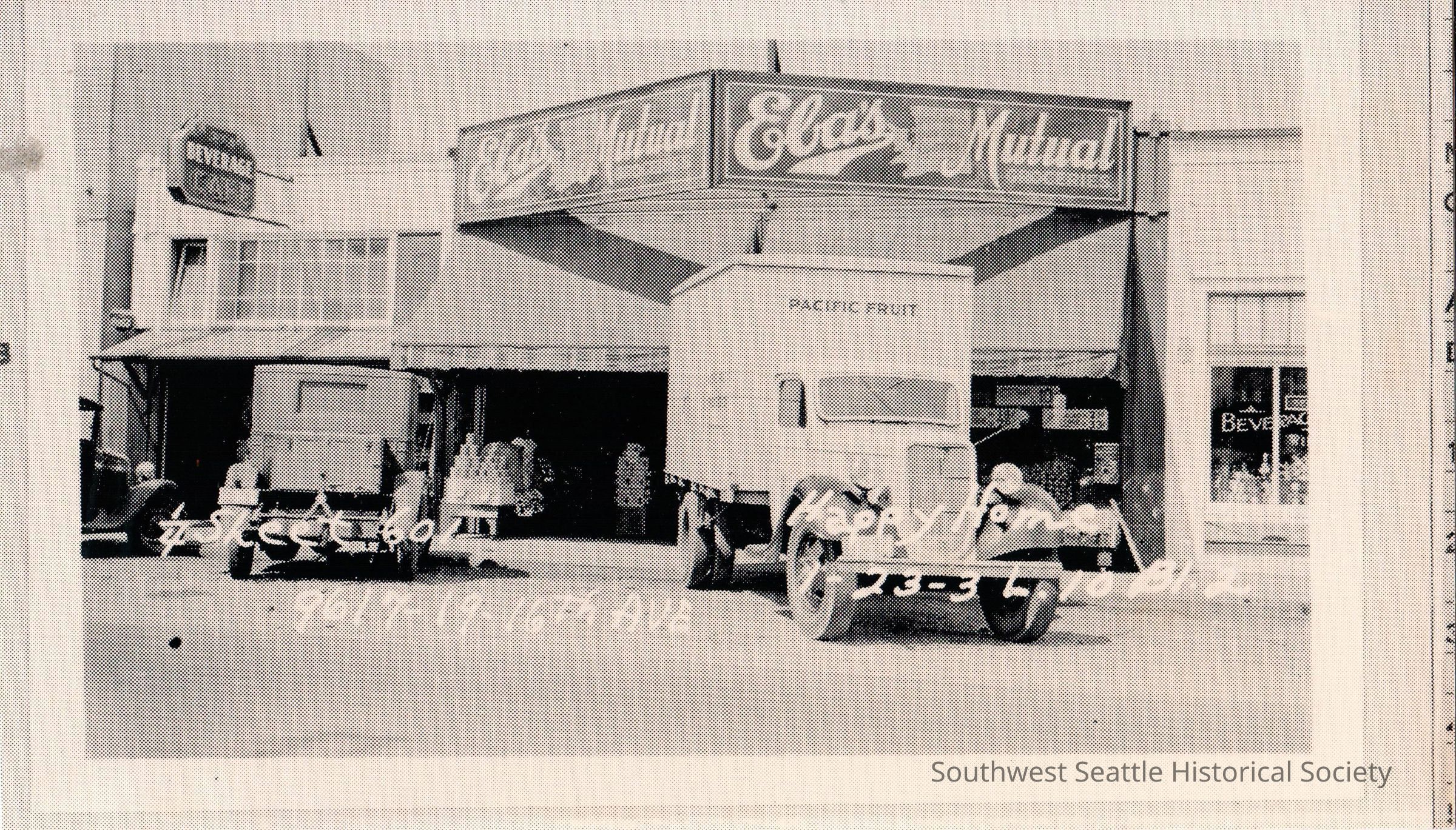 Black and White. Front view of Ela's Mutual Groceries. Two trucks are infront of the store; front facing truck has Pacific Fruit above cab. 1/4 sheet 601, 9617-19-16th Ave, Happy Home 1-23-3 L.10 B1-2; on front of picture.Collection