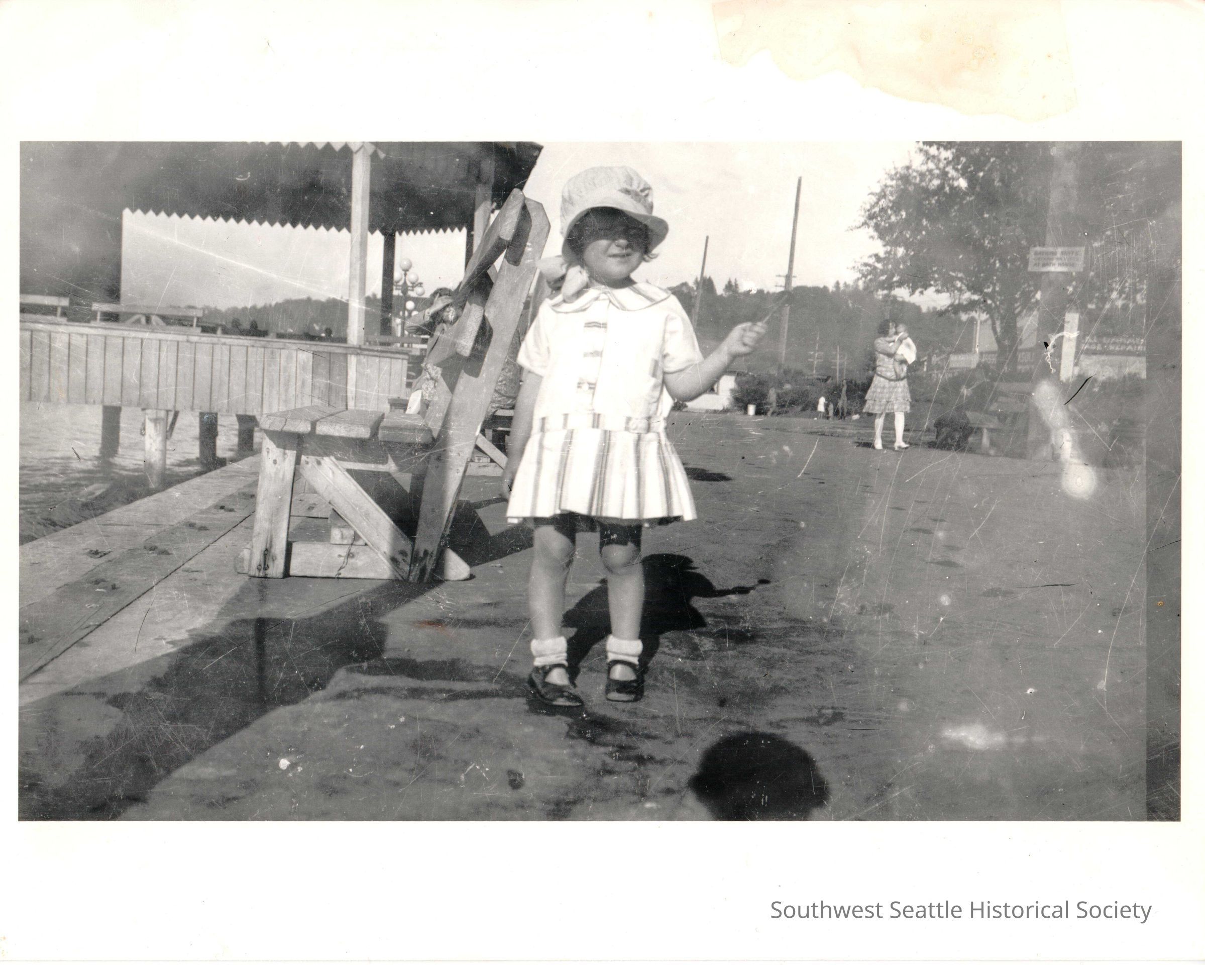 Female child in dress, hat and mary jane shoes holding a lollipop posing next to Alki bandstand on boardwalk. In background: walking woman in knee length dress, white stockings and heels carrying baby; "Associated Gasoline" station and garage; "bathing knits...at bath house" sign on pole, electric power poles Dated 1928 in black ink on back. Black and white photograph.Collection