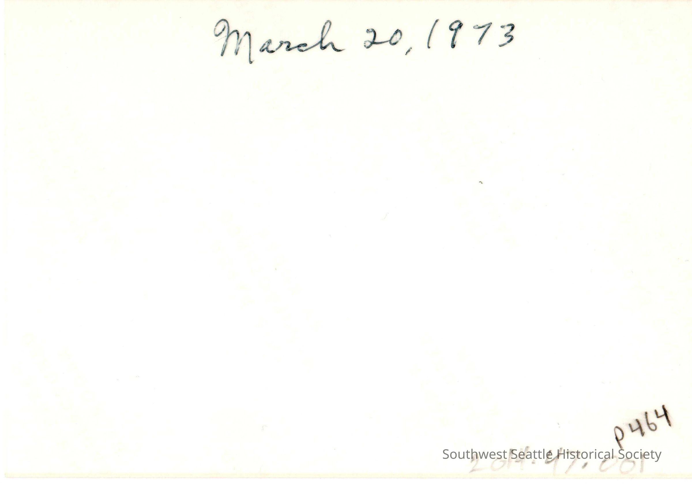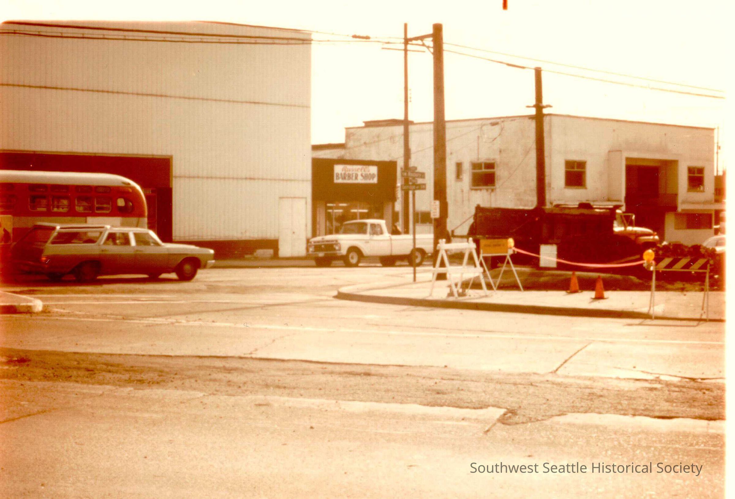 Photo of S.W. Roxbury St. and Delridge, White Center. 3/20/1973. Barber shop can be seen in background.