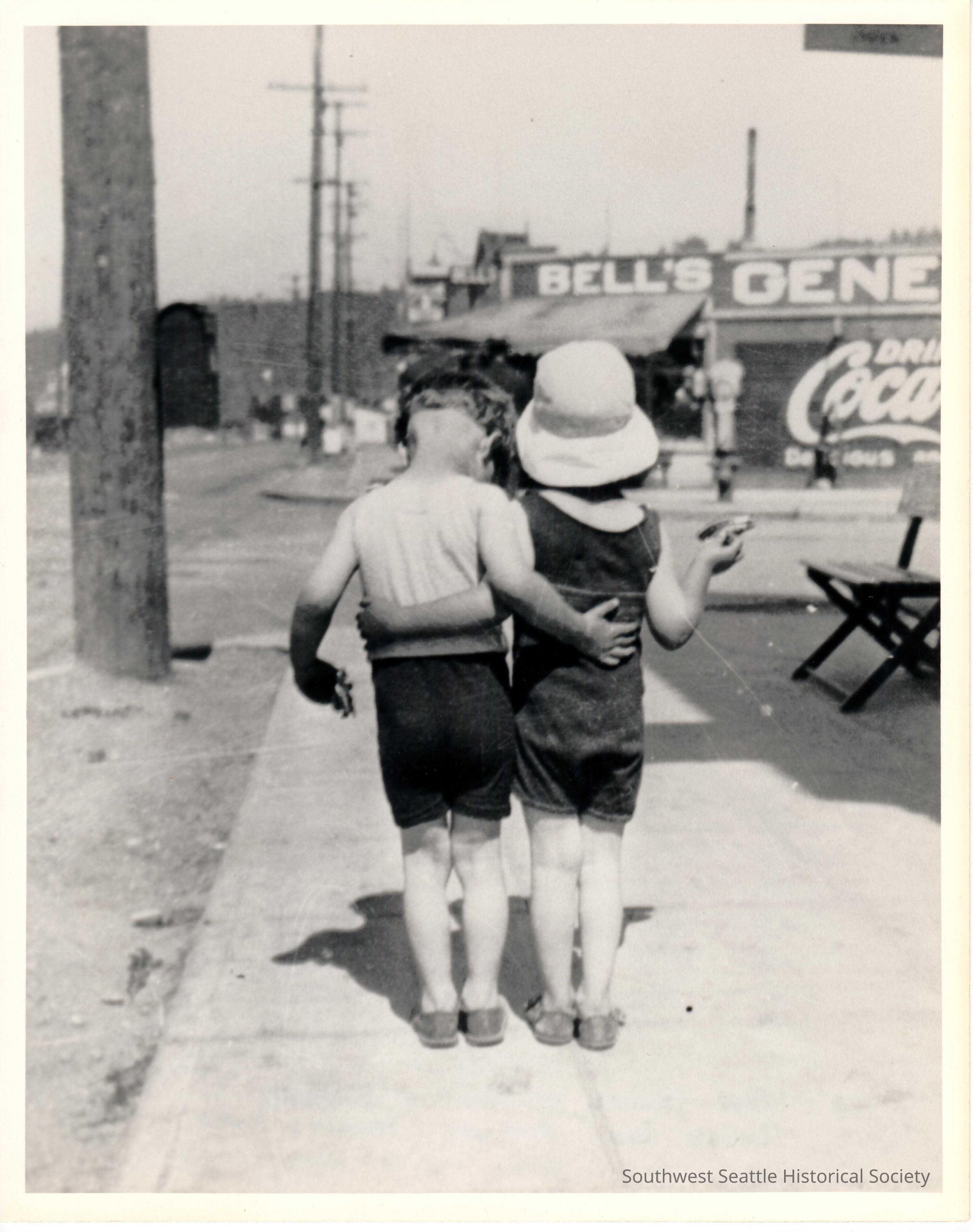 Rear view of two children with an arm around each other standing on the sidewalk facing Bell's General Store. Child on right has hat and one piece suit, child on left has sleeveless light colored shirt and dark shorts, both are holding something in their free hand, and have shoes on. On backside in black pen ink: "1926 - BOYS STANDING IN FRONT OF DRUGSTORE LOOKING DOWN ALKI AVE TOWARDS BEACH, BILLY BELLS STORE BURNED DOWN LATER" Black and white photo.Collection