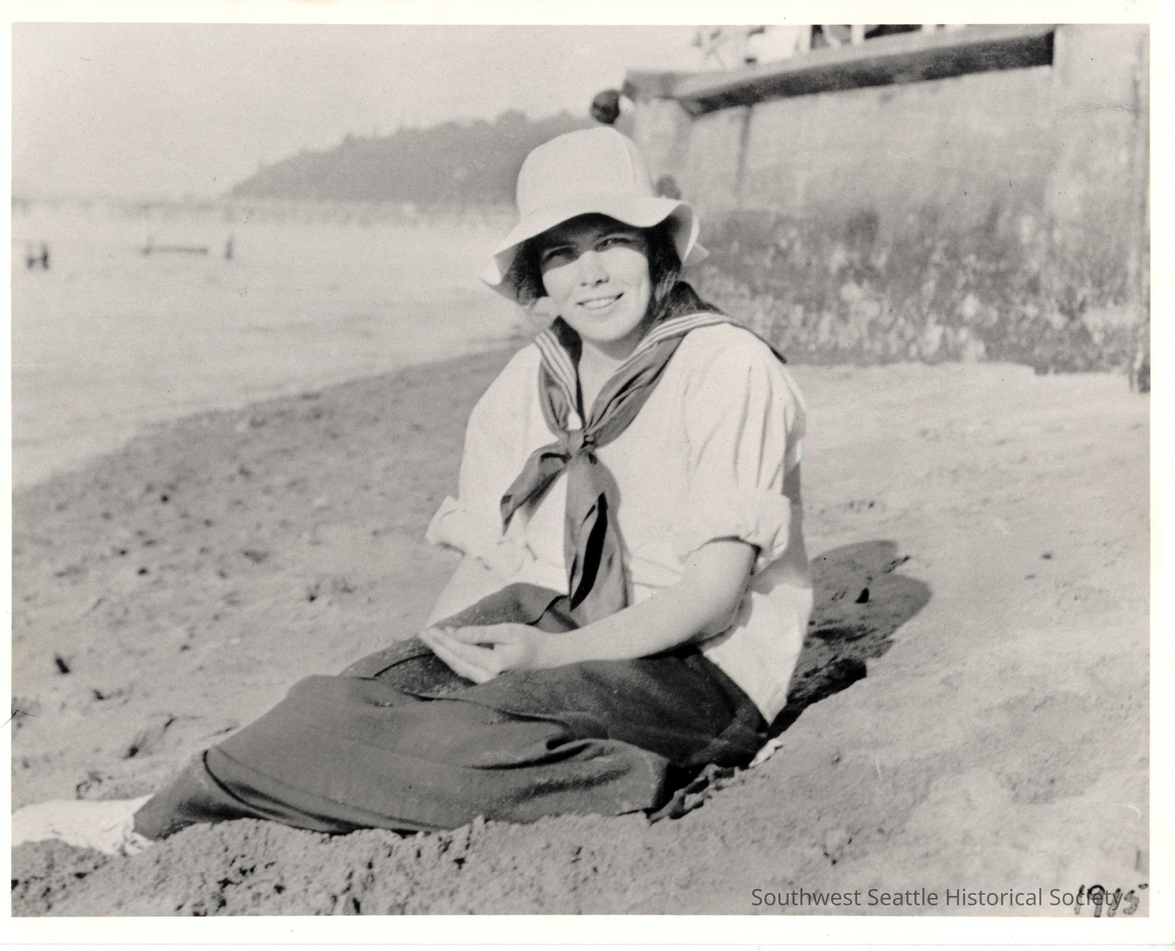 "Dorothy Snowden sitting in sand on Alki Beach, 1915" written in ink on backside of photograph. Woman wearing a floppy brimmed light color hat, sailor style shirt, scarf around neck and skirt sitting in sand in front of bulkhead. Smiling at camera and holding something in her hand. Black and white photo.Collection