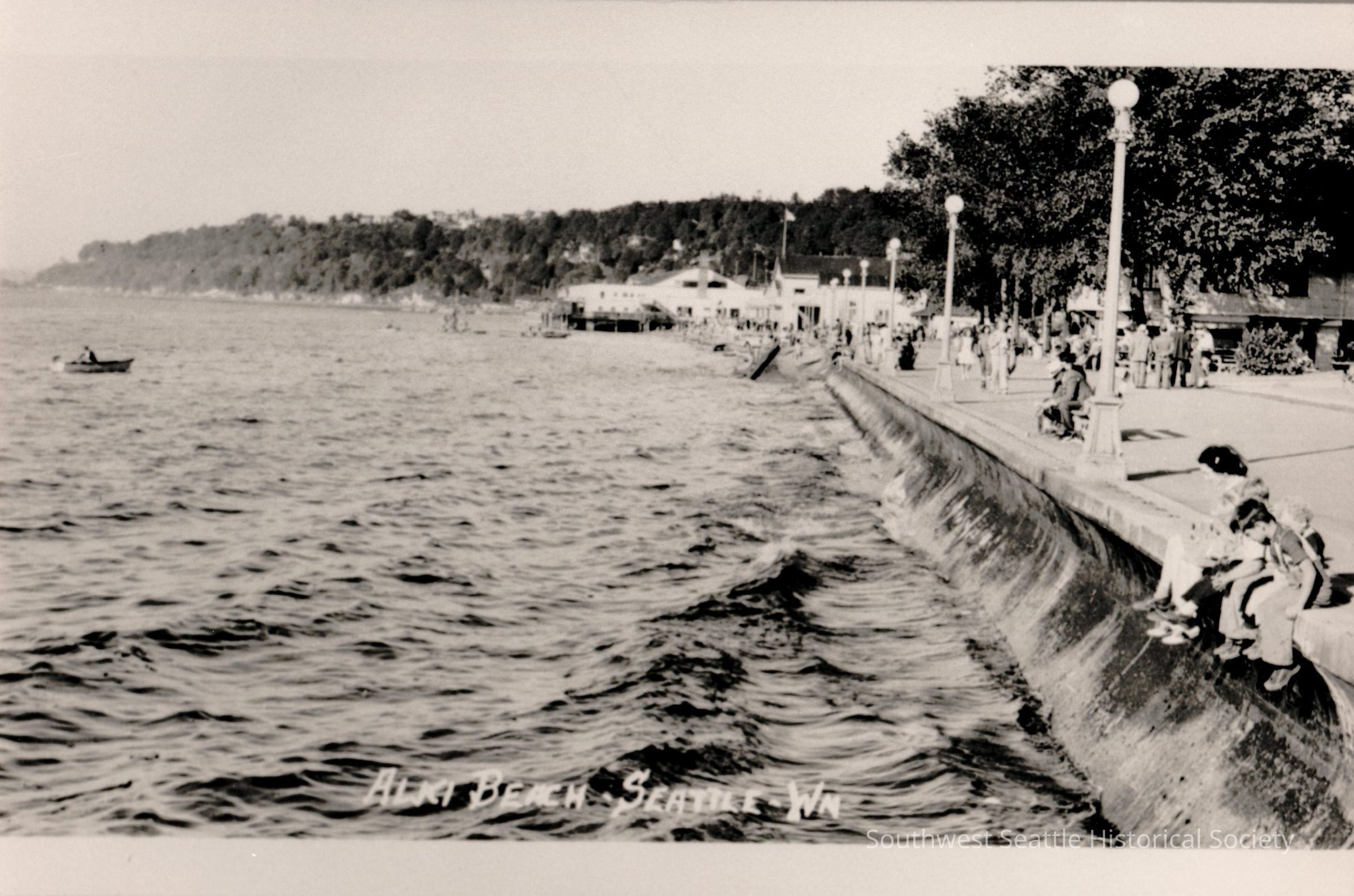 Globe lights on cement bulkhead at hightide. Adult woman and children sitting with their feet hanging off the edge. People walking and sitting on benches. Fieldhouse and Natatorium visible in background distance. Negative writing on white bottom center" ALKI BEACH - SEATTLE - WN" Black and white photograph of a photograph. AlkiCollection