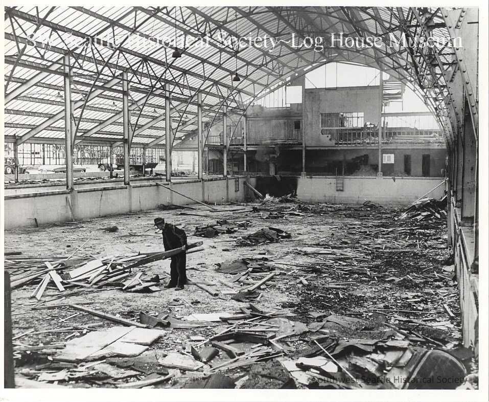 Alki Natatorium demolition of interior, dated 04/08/1953. Man in hat standing in the empty pool with a piece of lumber in his hands. Copy of the caption from the Seattle Times is taped to the back. "Donated by Dick Kaiuoda 03/87" Black and white photograph. Copyrighted.Collection