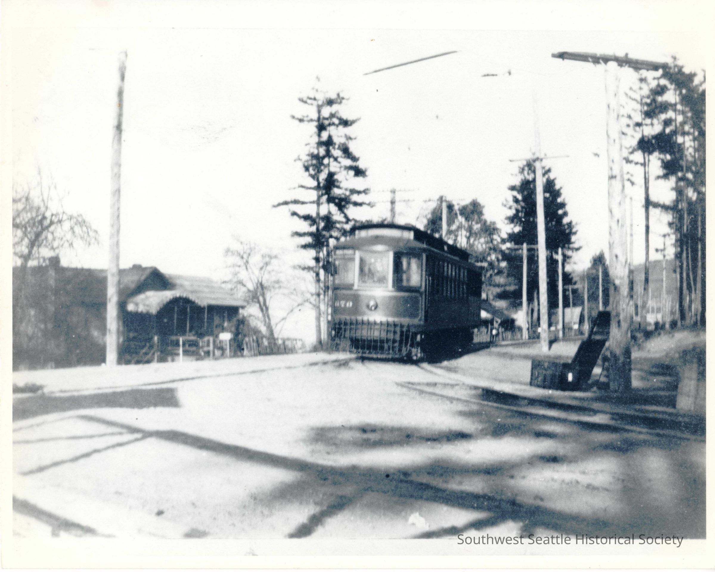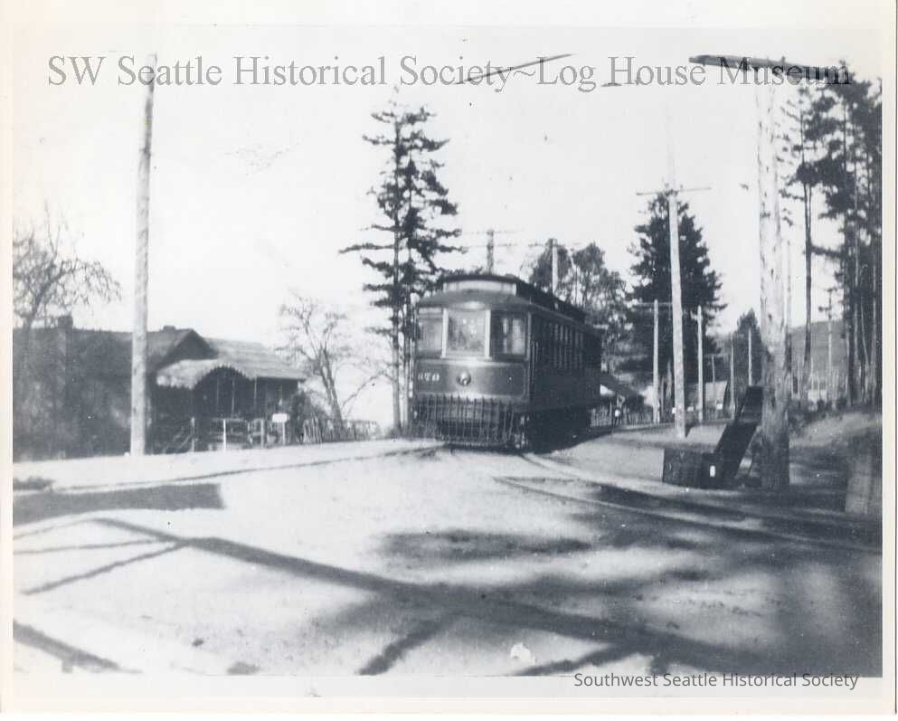 Intersection of Alki Avenue and 63rd, Streetcar across from Field House. The trolleys' were painted orange and deep red, almost maroon. Black & white photo printed on Kodak paper. See duplicate print 1992.002.0039.Collection