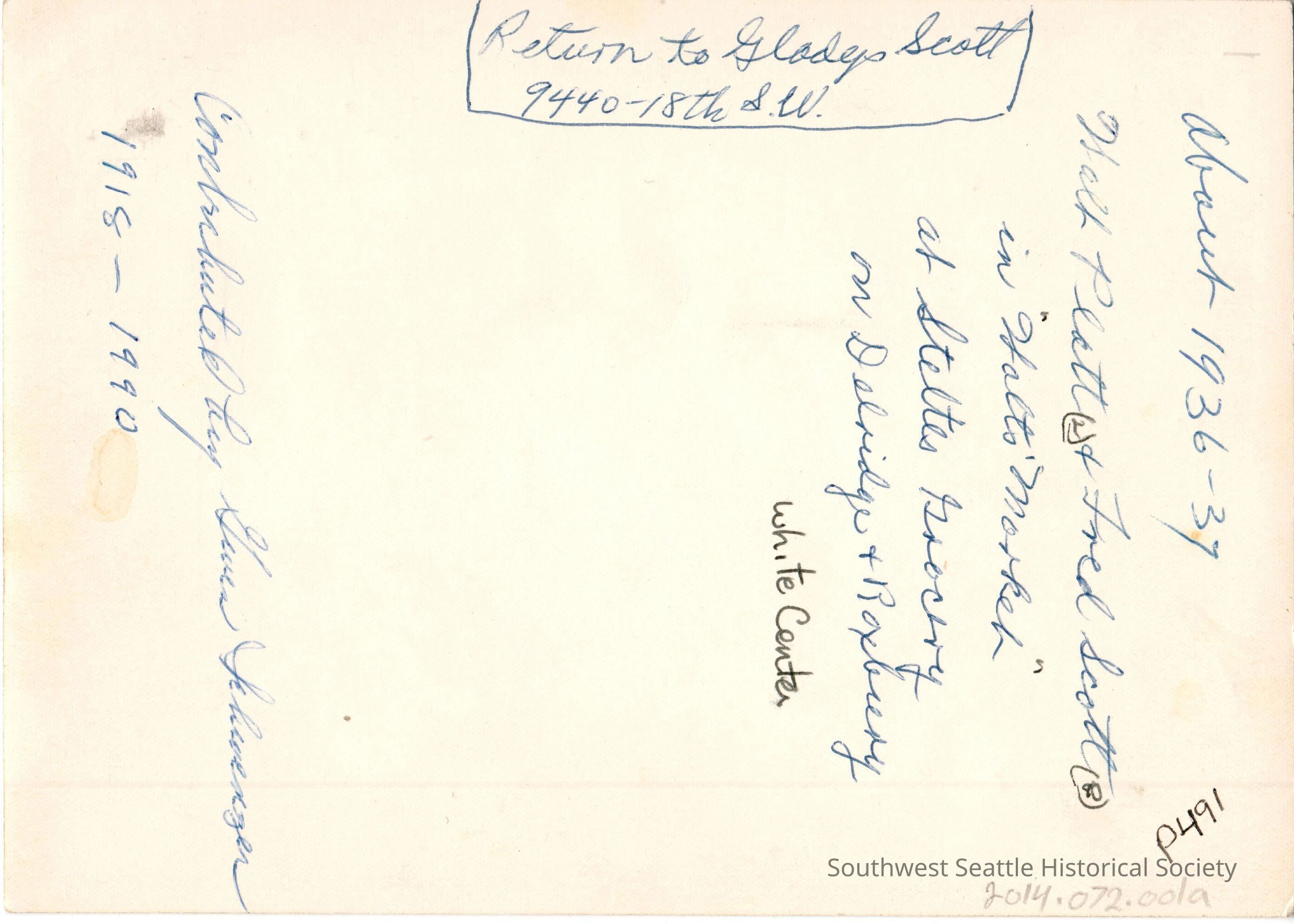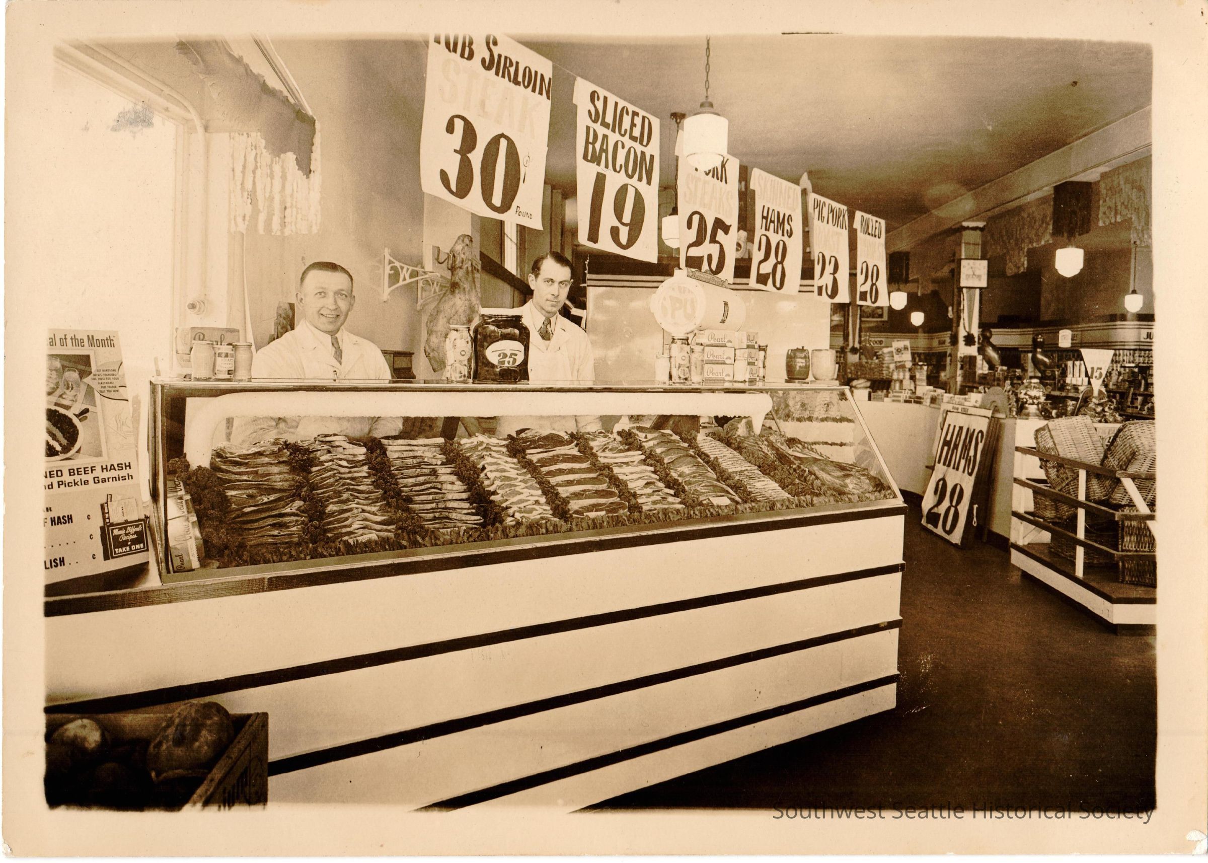 Black and White. Photo of Walt Platt and Fred Scott standing behind meat counter at Walt's Market. Located at intersection of Delridge Way and Roxbury St., White Center.Relationships