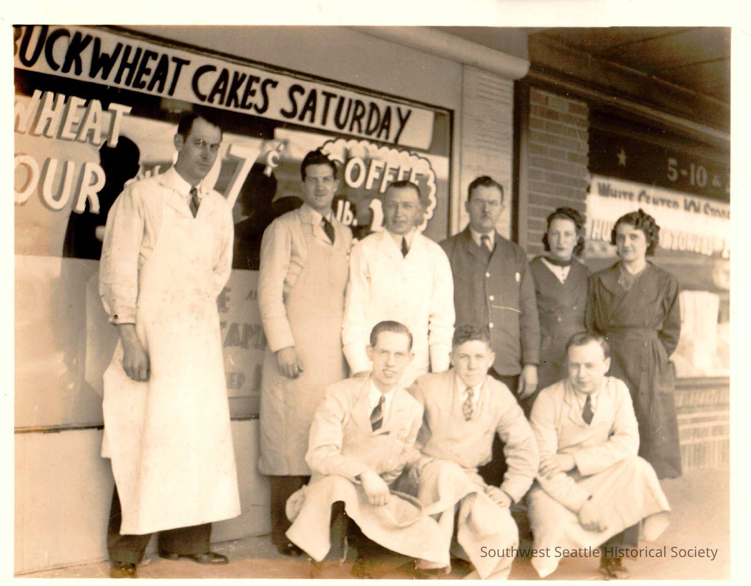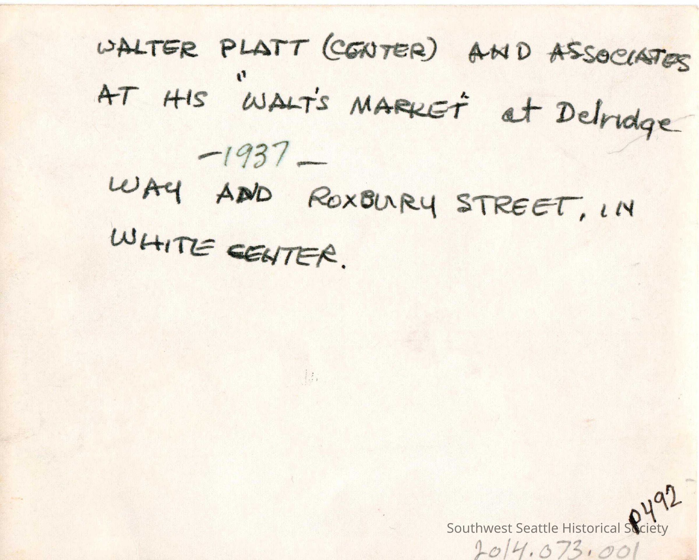 Black and White. Walter Platt and associates at "Walt's Market" at Delridge Way and Roxbury St., in White Center. Sign for "Buckwheat Cakes Saturday" can be seen in the background.Relationships