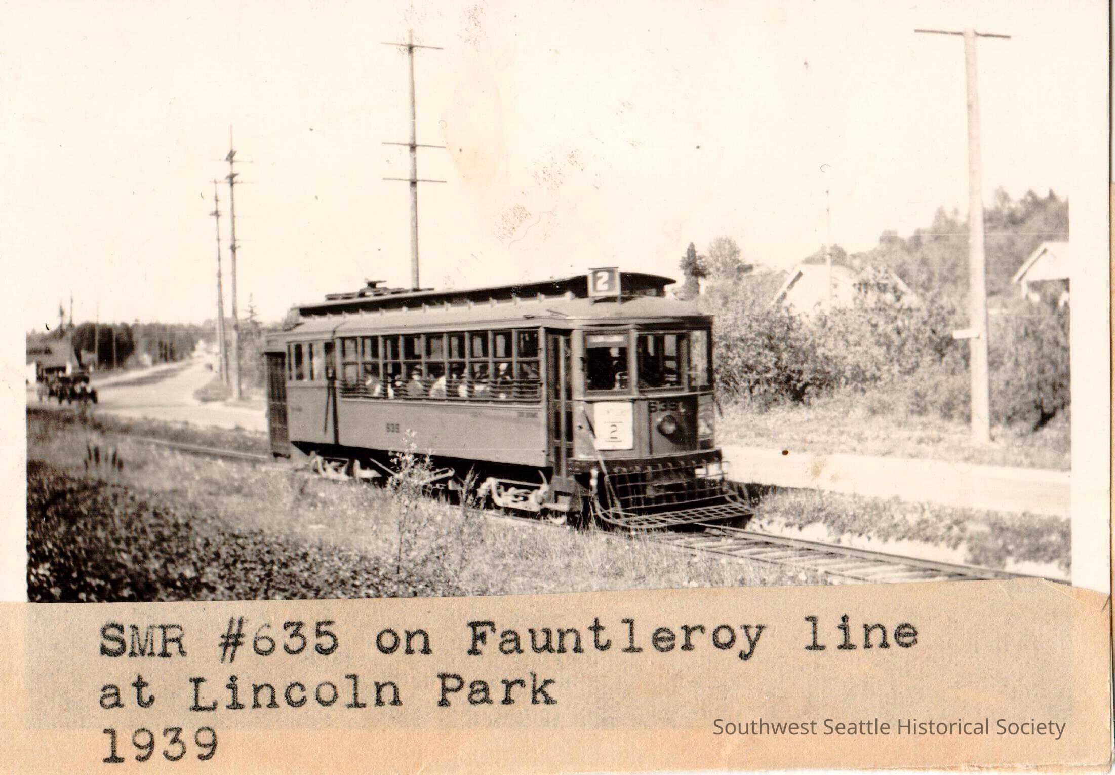 Streetcar #2 at Lincoln Park in 1939. "SMR #635 on Fauntleroy line at Lincoln Park 1939" Seattle Municipal Railway.