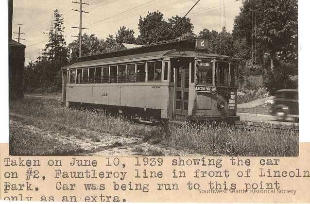 Streetcar on route #2 near Lincoln Park on June 10, 1939. Fauntleroy line, car #356.