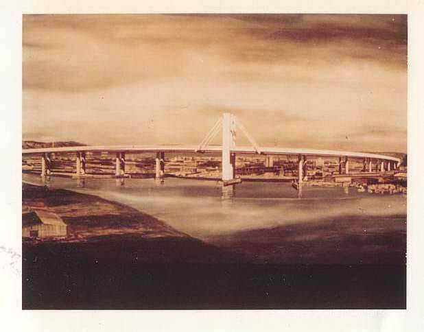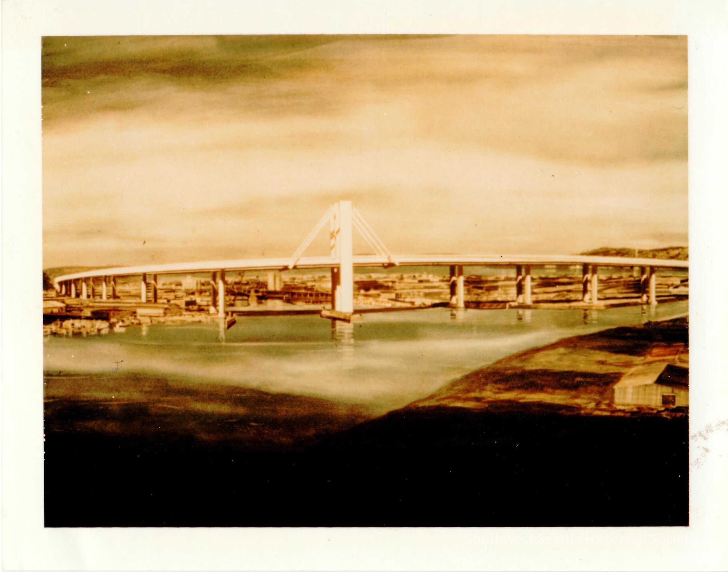 Model or painting of proposed West Seattle Bridge. Shows sky, river, and background. (color photo)
