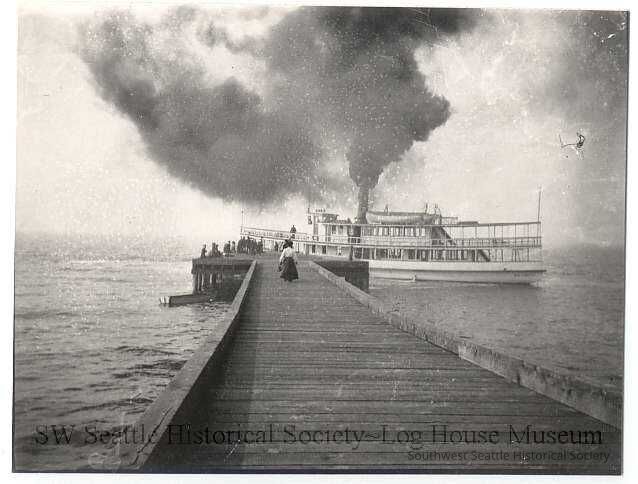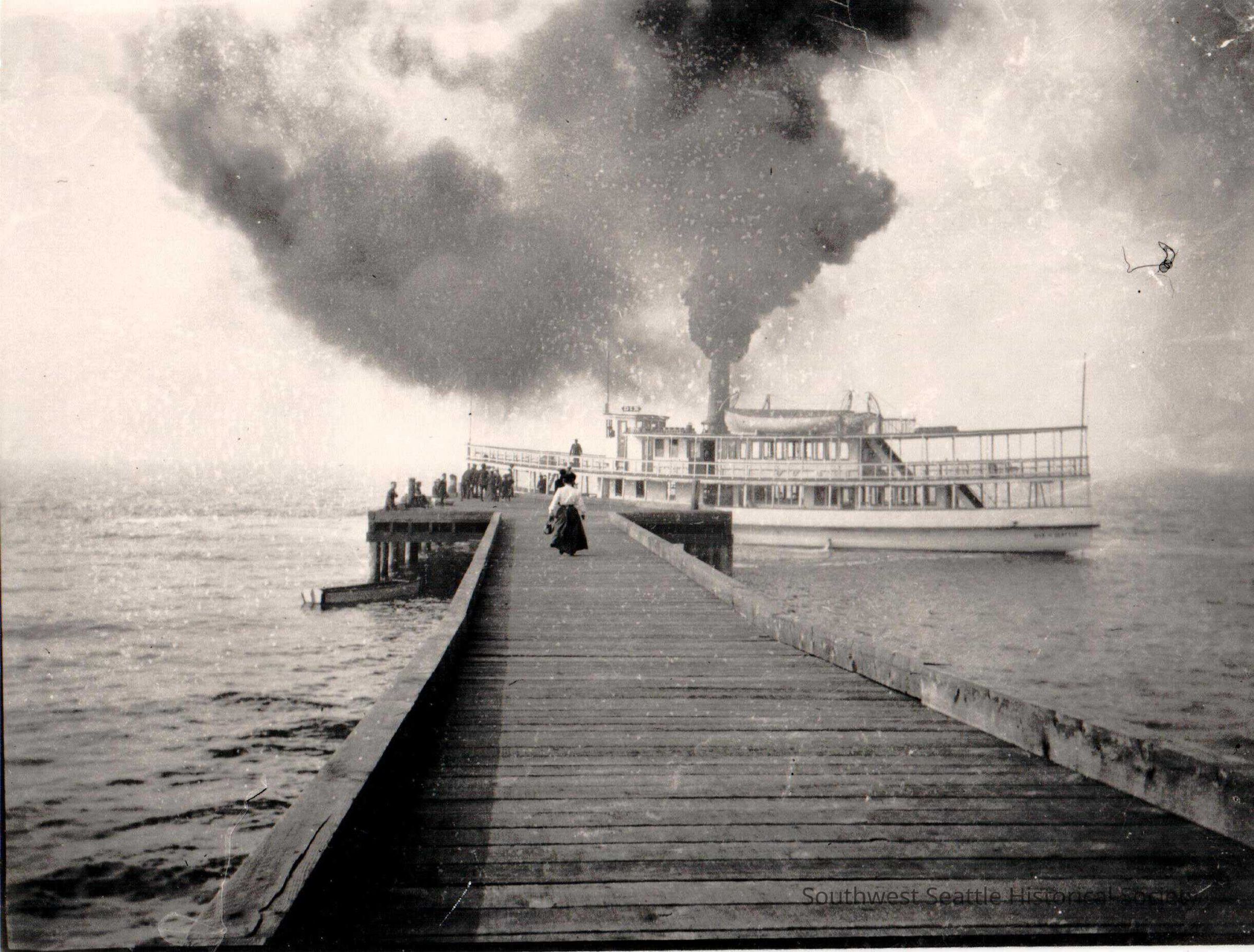Steamer "Dix" at Alki landing , looking west toward Elliott Bay. Shows female passengers walking on dock toward the vessel, and shows a cloud of smoke from the smokestack. The "Dix" later sank after a collision off of Alki Point with large loss of life.