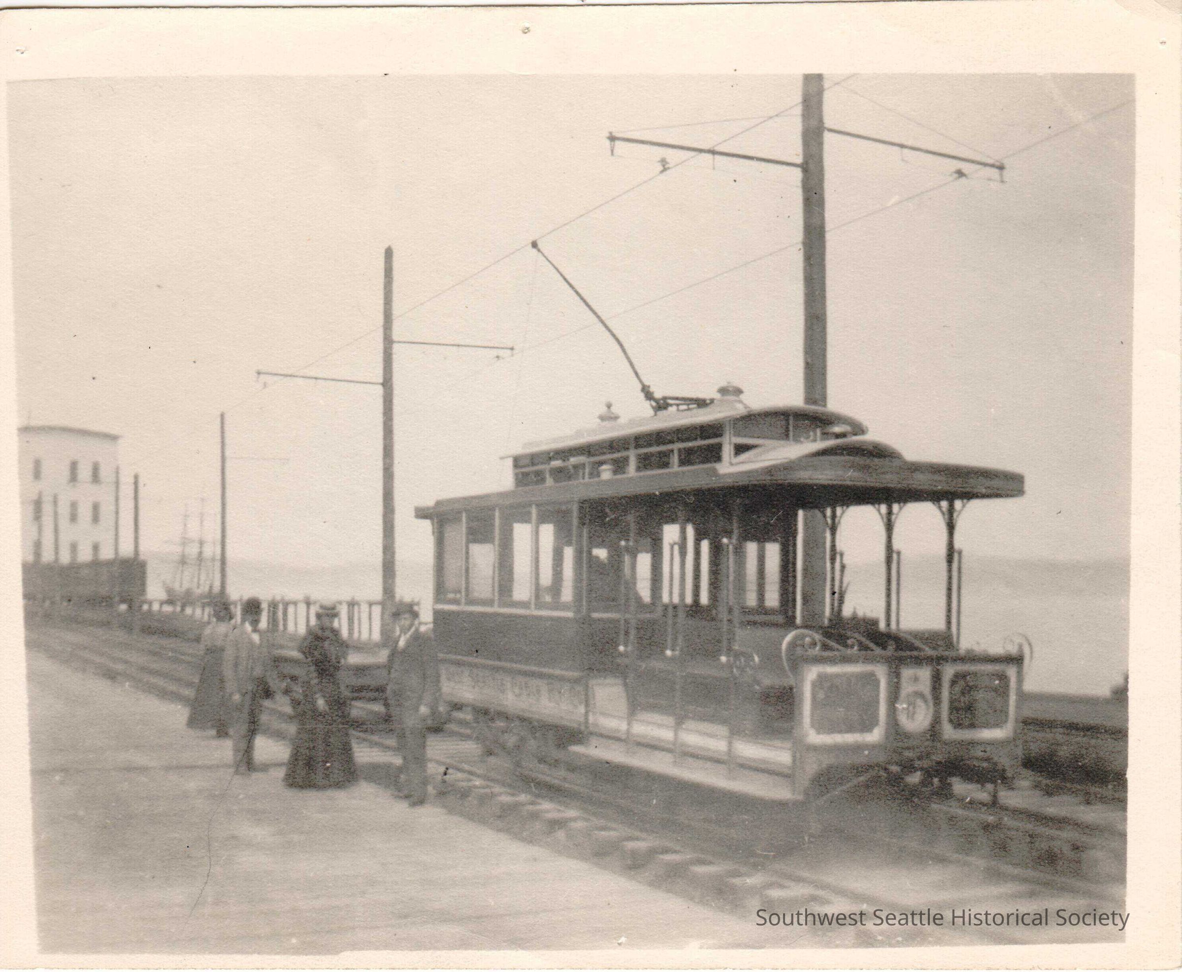 "Dinky" streetcar-actually former cable car. Side of car reads "West Seattle Cable Railway Co." Converted to electric power. Shown south of the Novelty Mill along Harbor Avenue. Four riders posing along side of the streetcar.Relationships