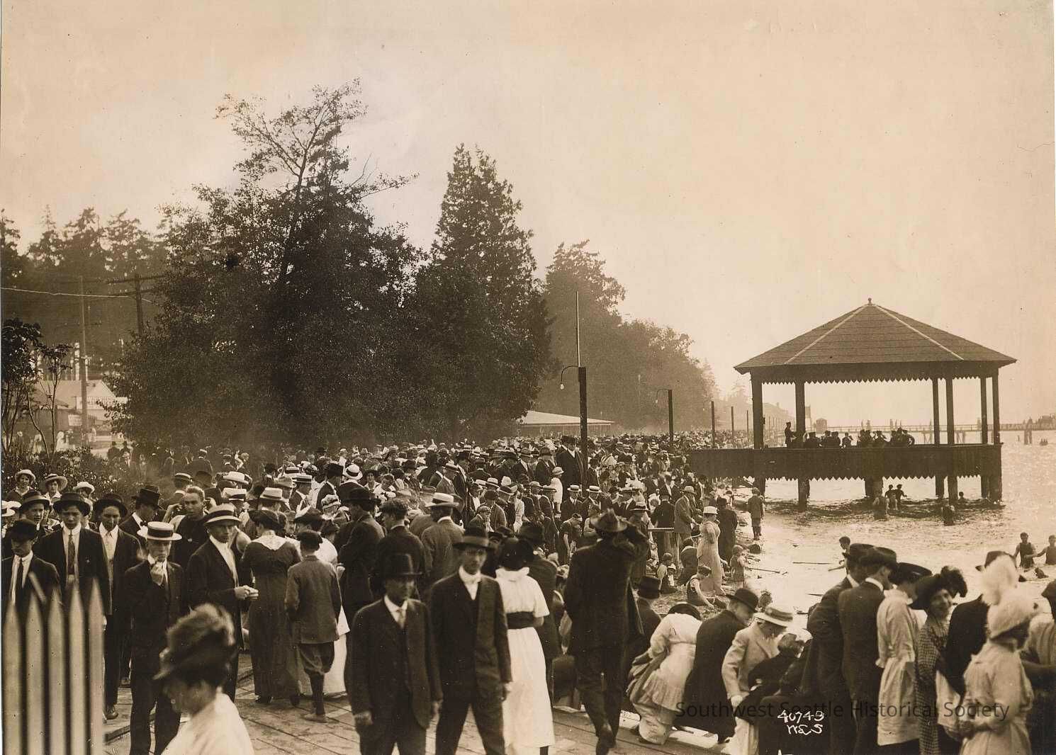 Alki Beach B&W with crowds walking the boardwalk. Band in gazebo bandstand playing over water. Bathers in water. Mosquito fleet dock in background, "BOATS LEAVE FOR SEATTLE" sign visible on side. Single bulb lighting down the boardwalk.