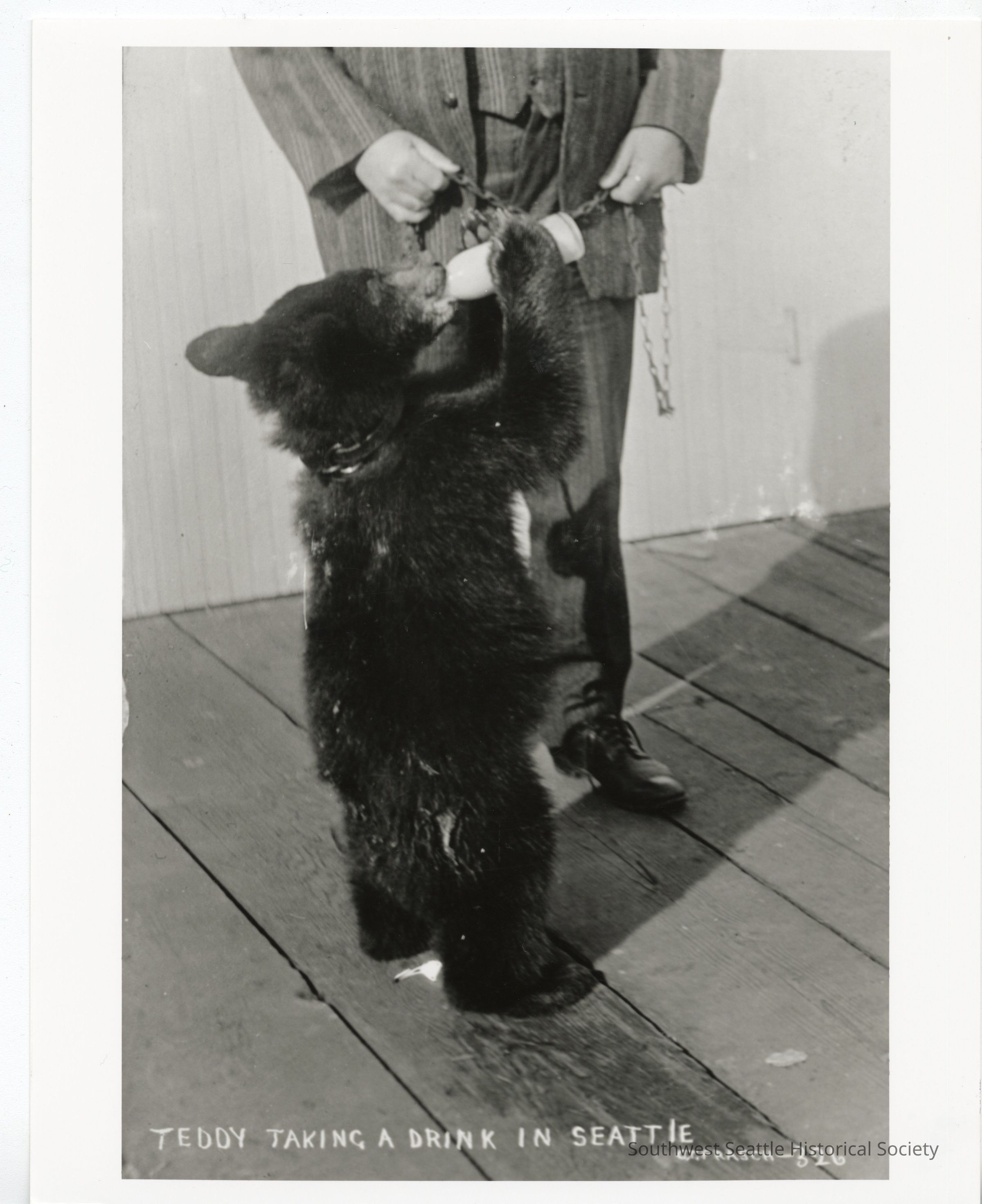 BW Photograph Bear cub named 'Teddy' is fed milk as part of a Luna Park attraction.