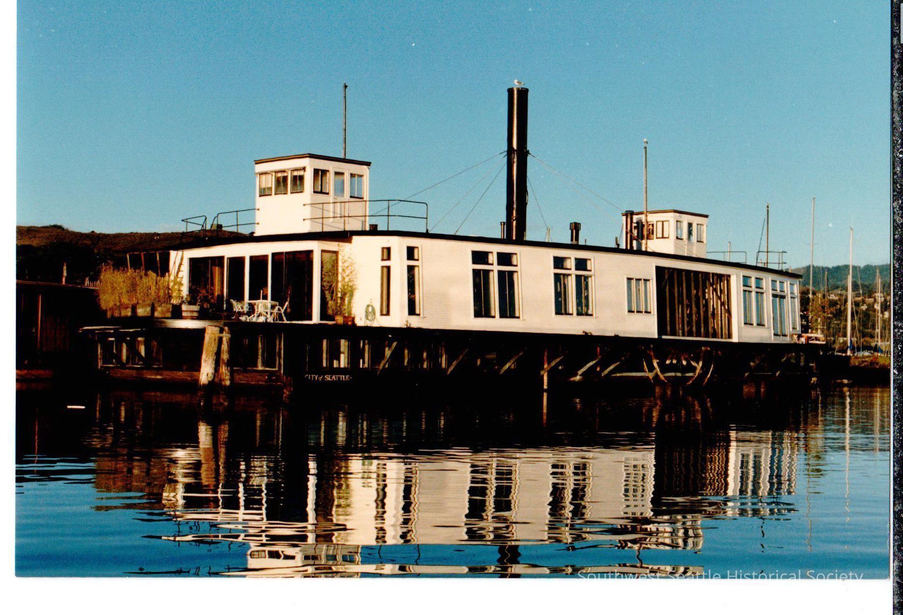 Color. Ferry turned houseboat, named "City of Seattle".