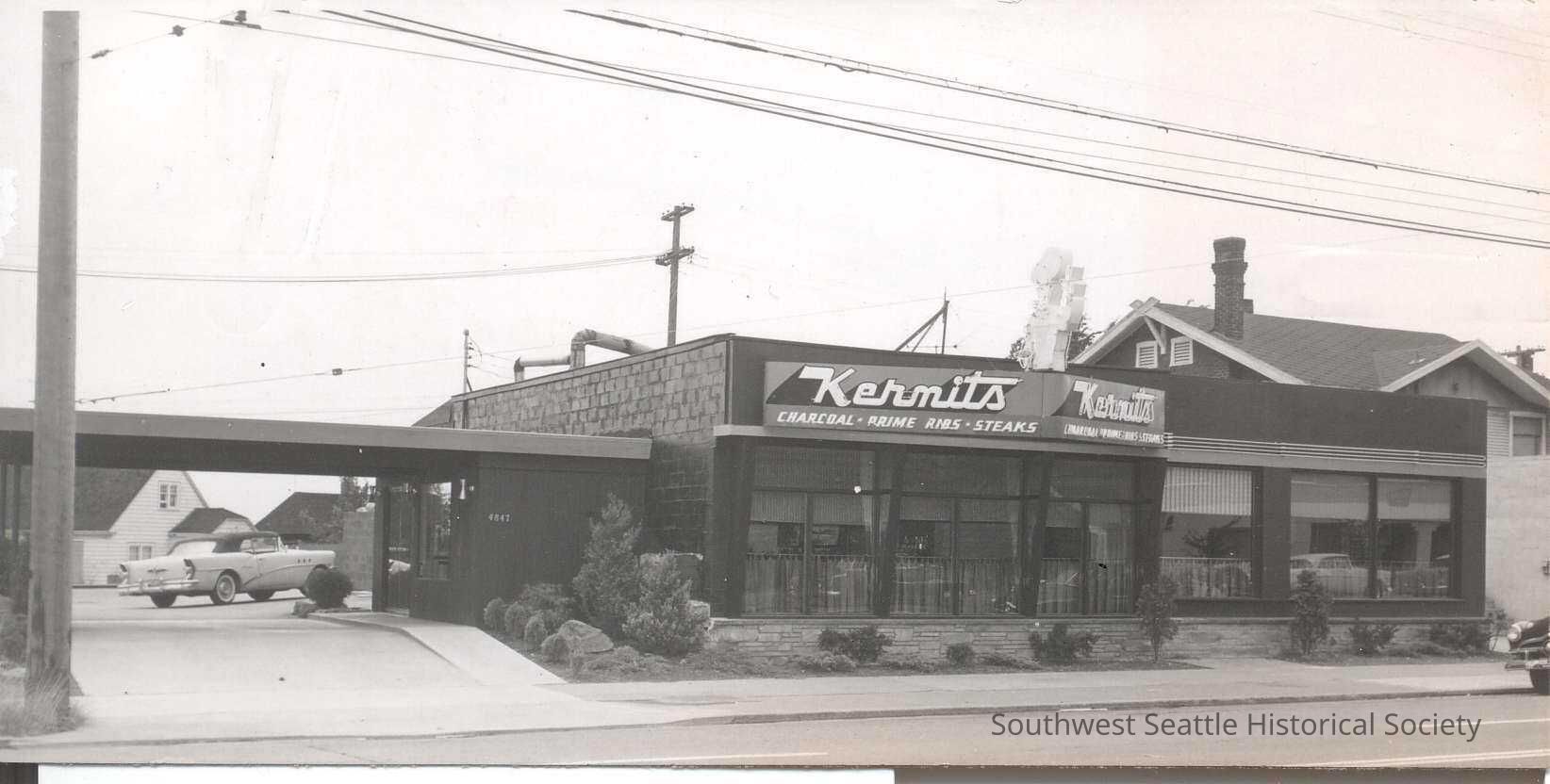 Photo of Kermits Restaurant after new entrance and parking area had been added to the South. Photo shows a covered parking area to the left of the restaurant.