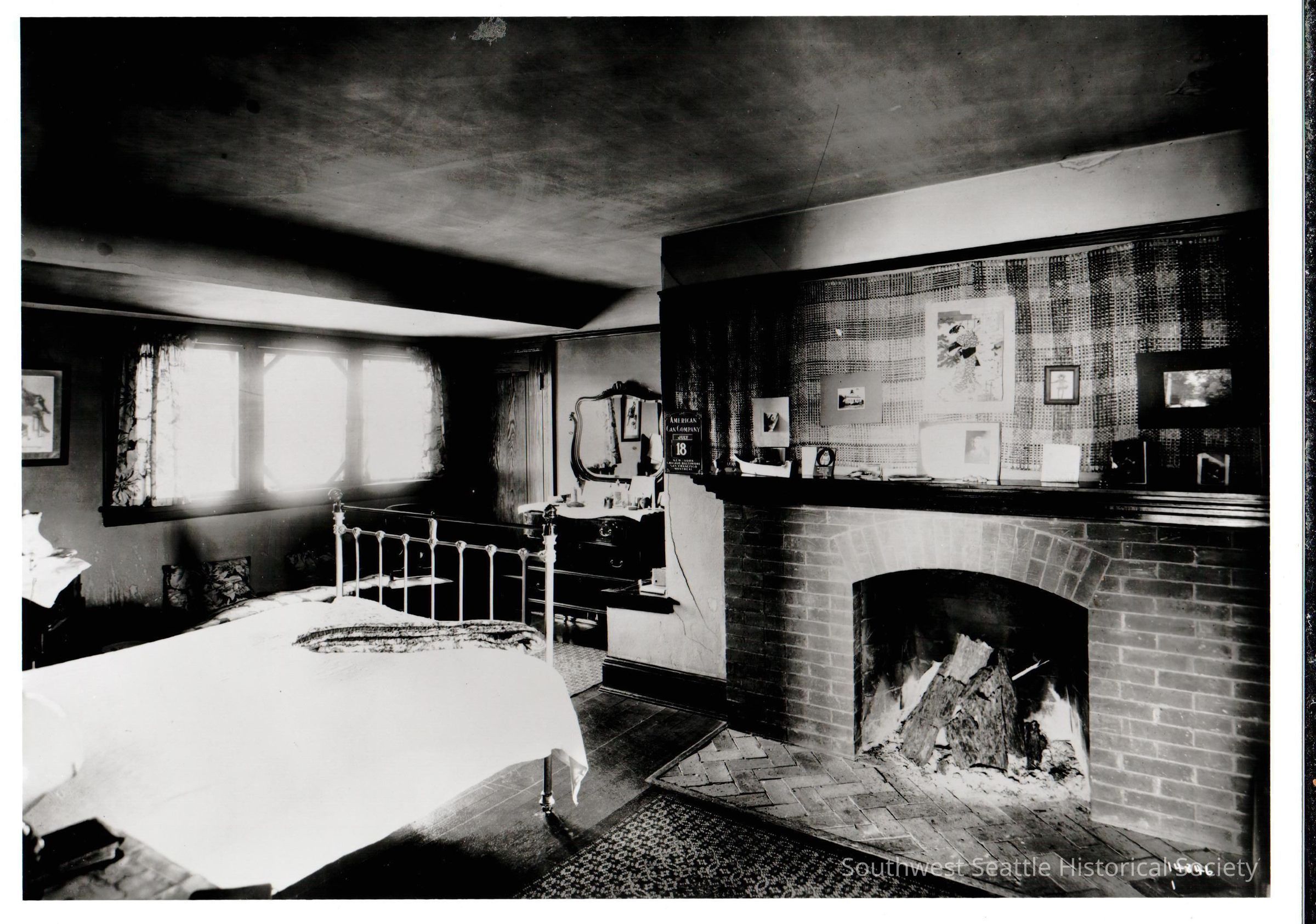 Black and White. Bedroom of Rose Lodge. Room has a large fireplace against one wall, with pictures hanging above it. There is a bed with a metal frame facing the fireplace.