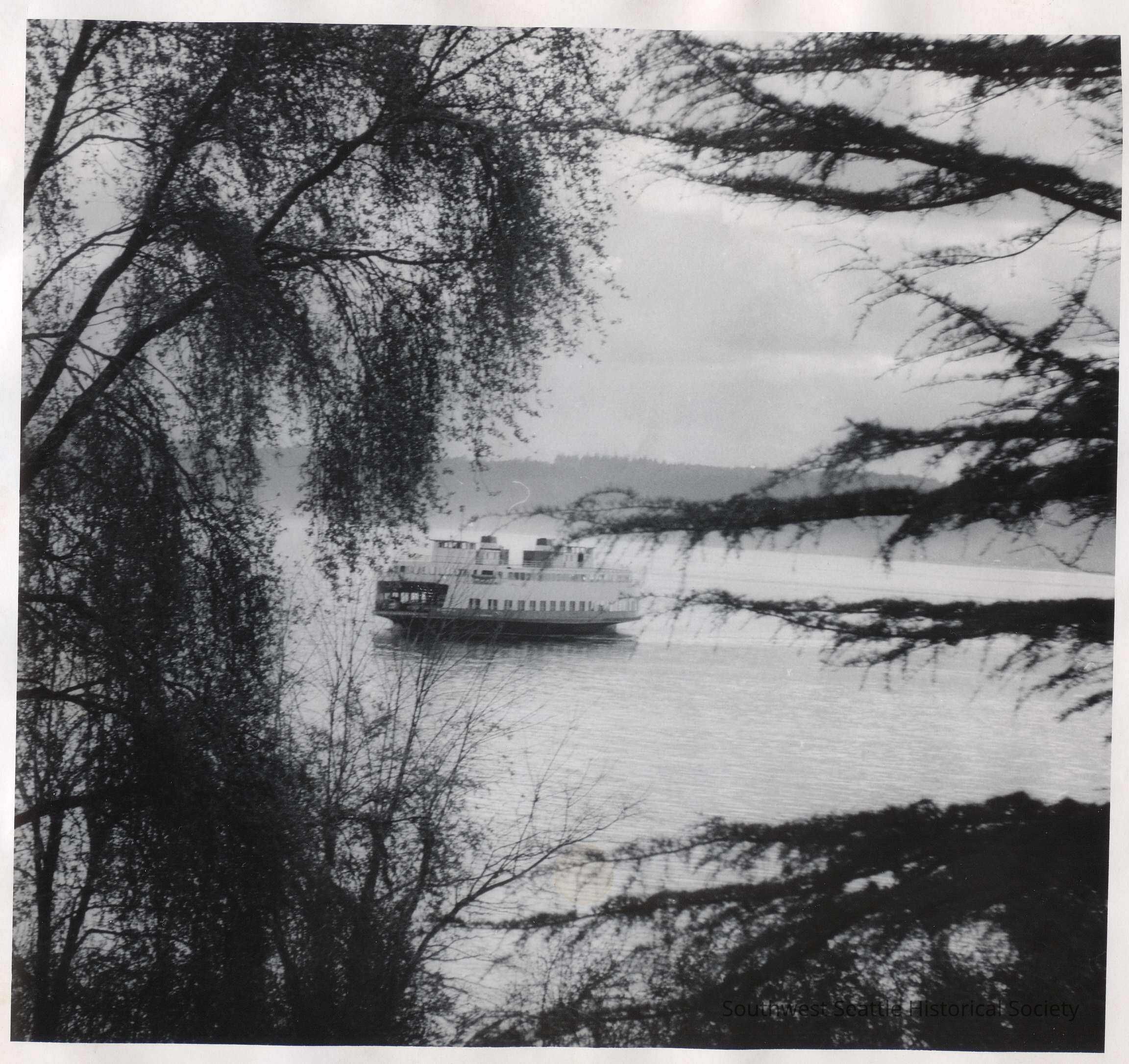 Photograph of the Fauntleroy ferry. Camera is looking through some trees out onto the water. On reverse: "Fauntleroy Ferry, KLEE"