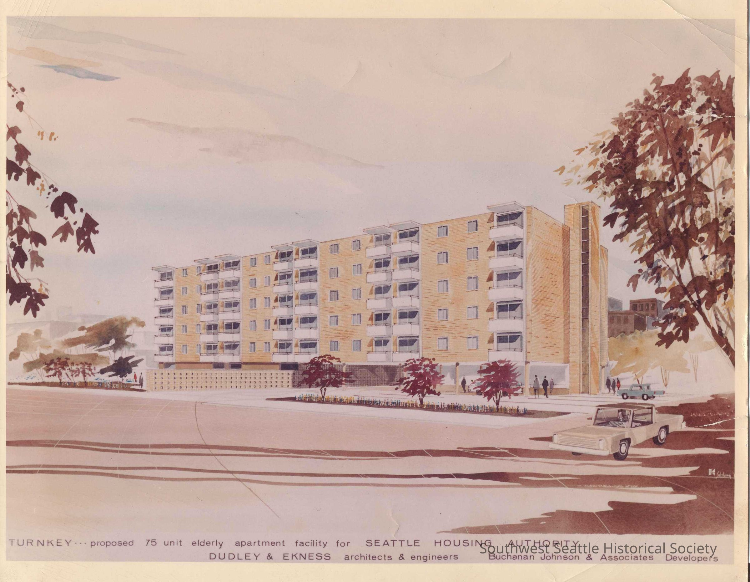 Photograph of an architect's rendering of some Seattle Housing Authority Apartments. The complex is named "High Point Court". The front reads "TURNKEY... proposed 75 unit elderly apartment facility for SEATTLE HOUSING AUTHORITY. DUDLEY & EKNESS architects & engineers. Buchanan Johnson & Associates Developers"