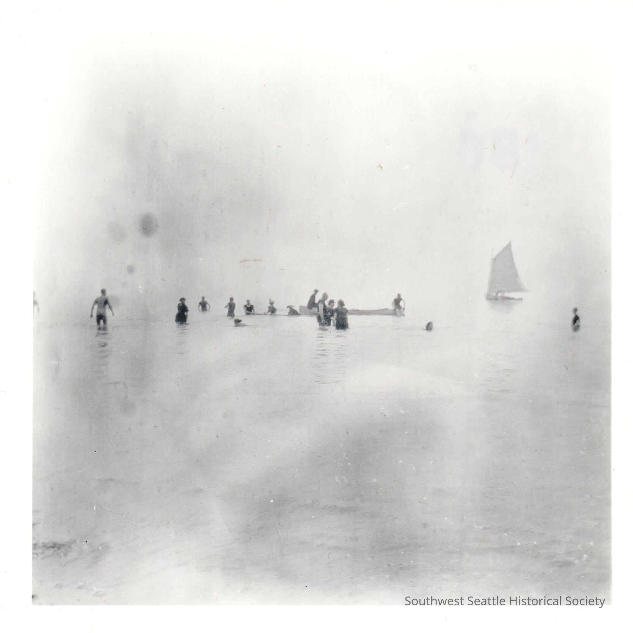 Photograph of people swimming and enjoying the water, likely taken in the vicinity of the Coney Island Bathhouse. Two boats are visible - a rowboat with a person sitting on it, and a sailboat (a gaff-rigged catboat) in the background.