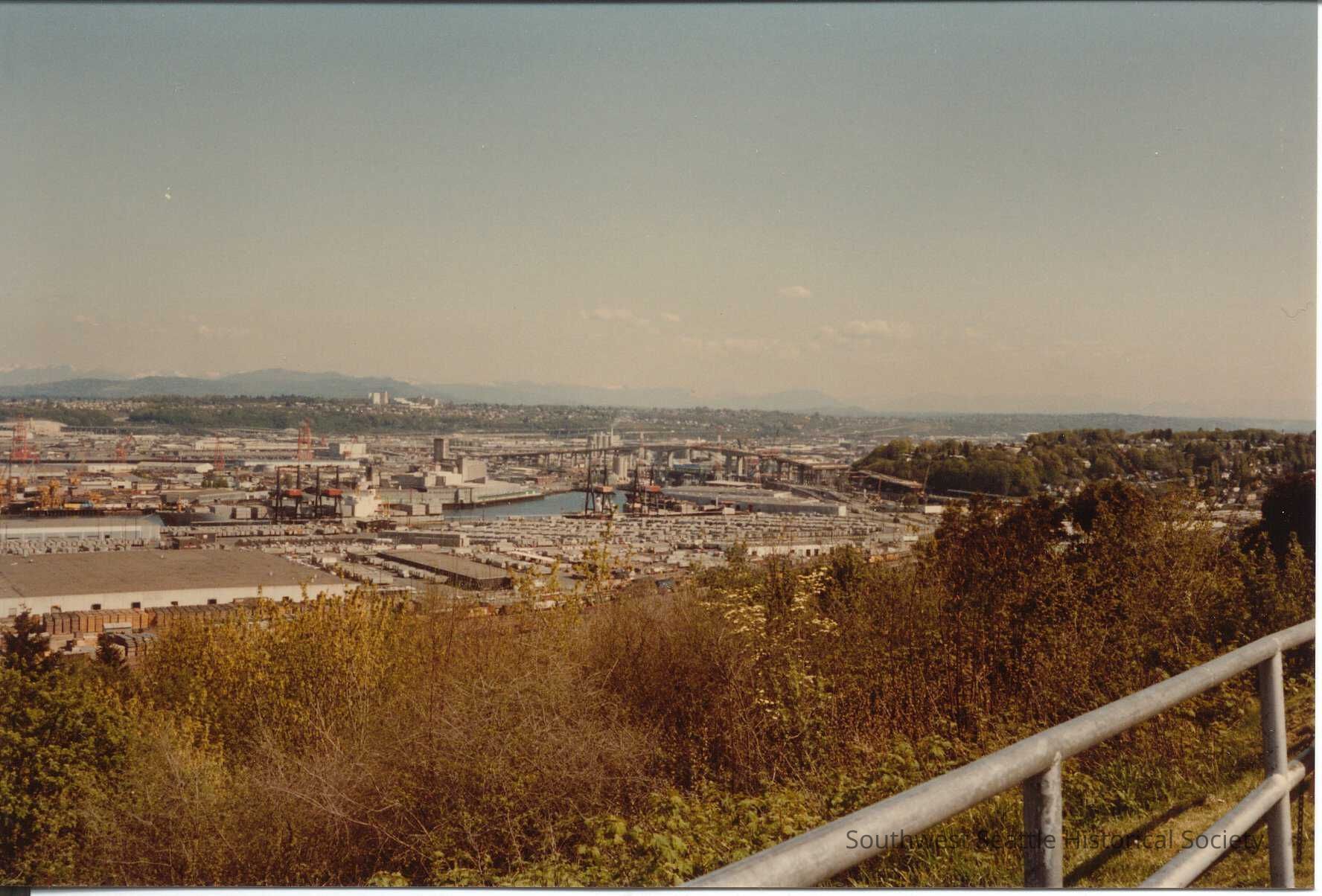 Color photo of the view of Harbor Island and the Duwamish River from Belvedere Viewpoint. Photo is dated 4/14/83.