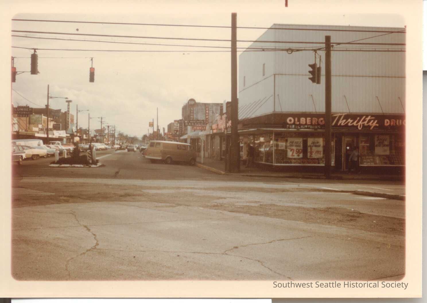 Photo of 16th Avenue and Roxbury Street looking south. On the right, Olberg Thrifty Drug Store is pictured. Photo is dated 3/20/1973. White CenterCollection