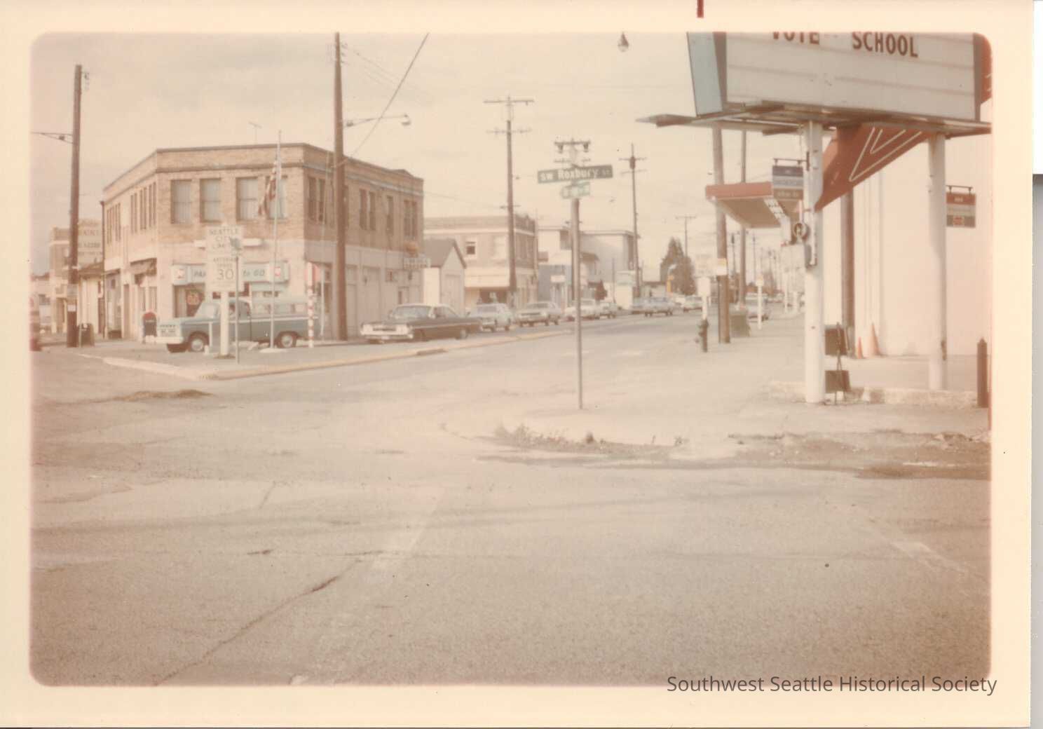 Photo of 16th Ave SW and SW Roxbury in White Center, looking North. Photo is dated 3/20/1973.
