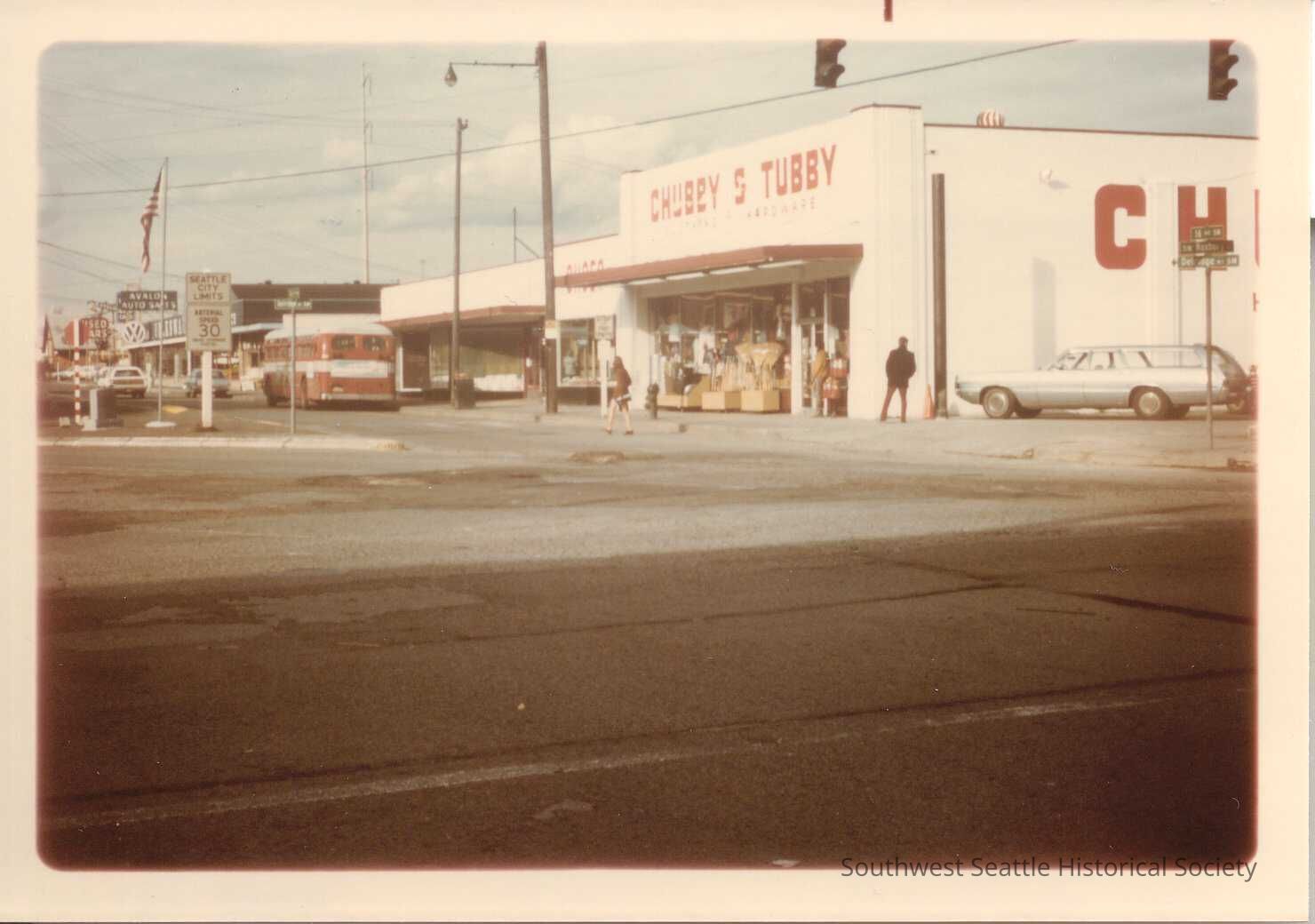 Photo of 16th Ave S and SW Roxbury in White Center looking North. Picture shows Chubby and Tubby and Avalon Auto Sales. Photo is dated 3/20/1973.Collection