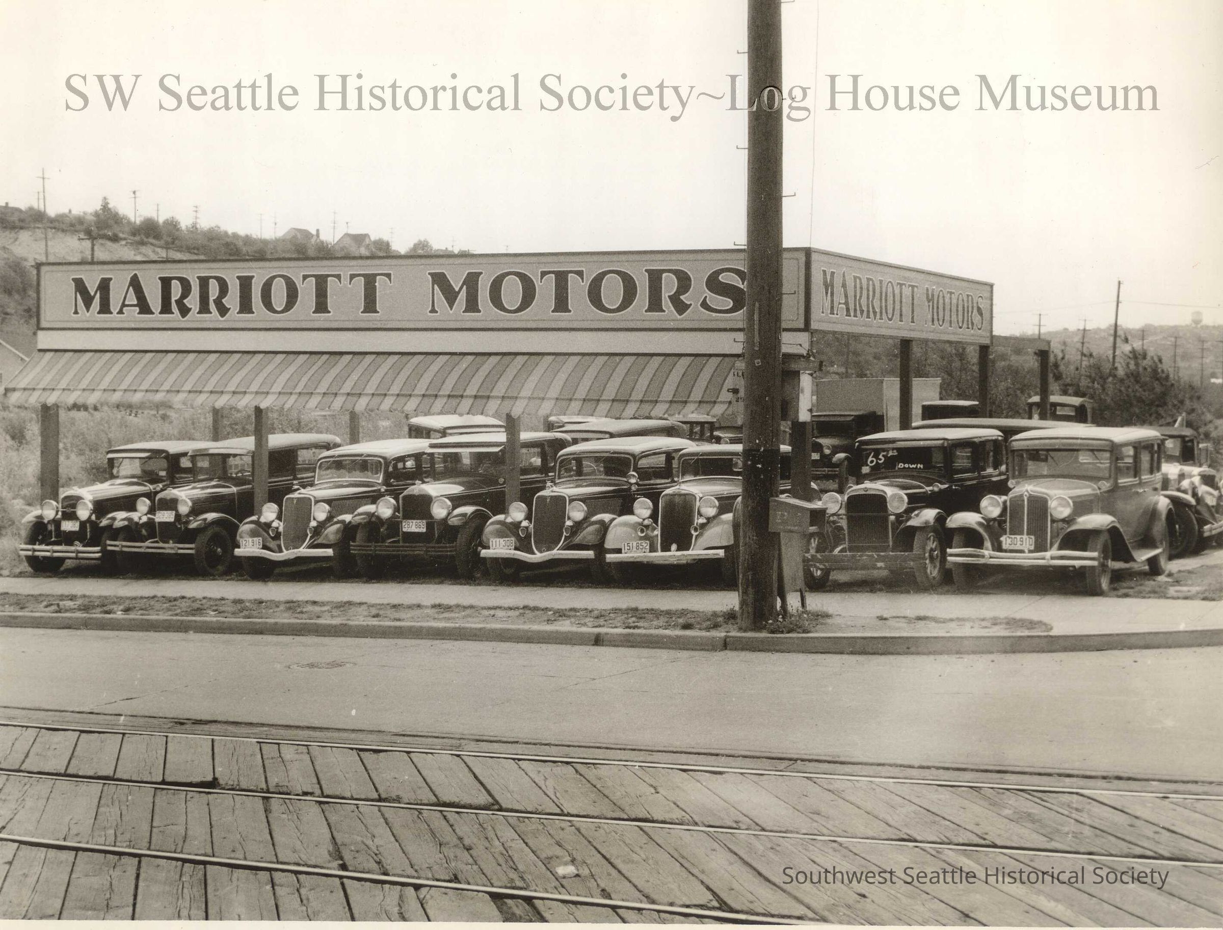 Marriott Motors used car lot on SW Alaska Street, one car has $65- down on the windshield. B&W.