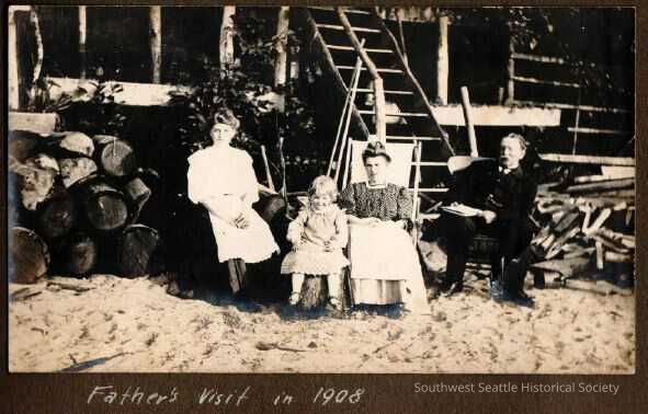 BW photo, family seated in front of beach house. Donor's Aunt Sopie Graebcke, Meta Kroll, Johanne Kroll, Carl Kroll (Donor's grandfather visiting from Germany)Collection