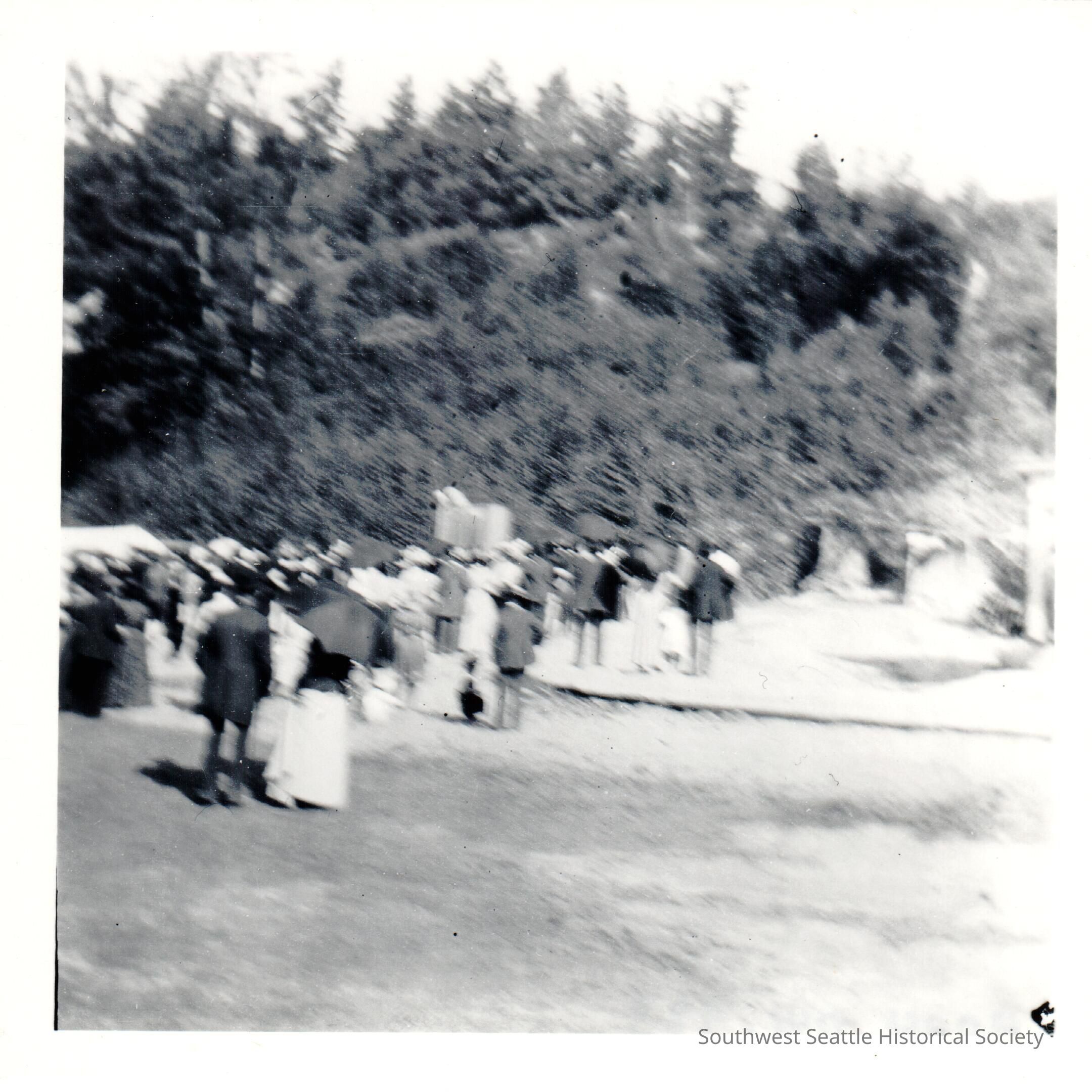 Photograph of a crowd of people facing away from the camera on a sunny day likely near the Coney Island Bathhouse at Duwamish Head. There is foliage in the background. The photograph is out of focus.Collection
