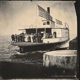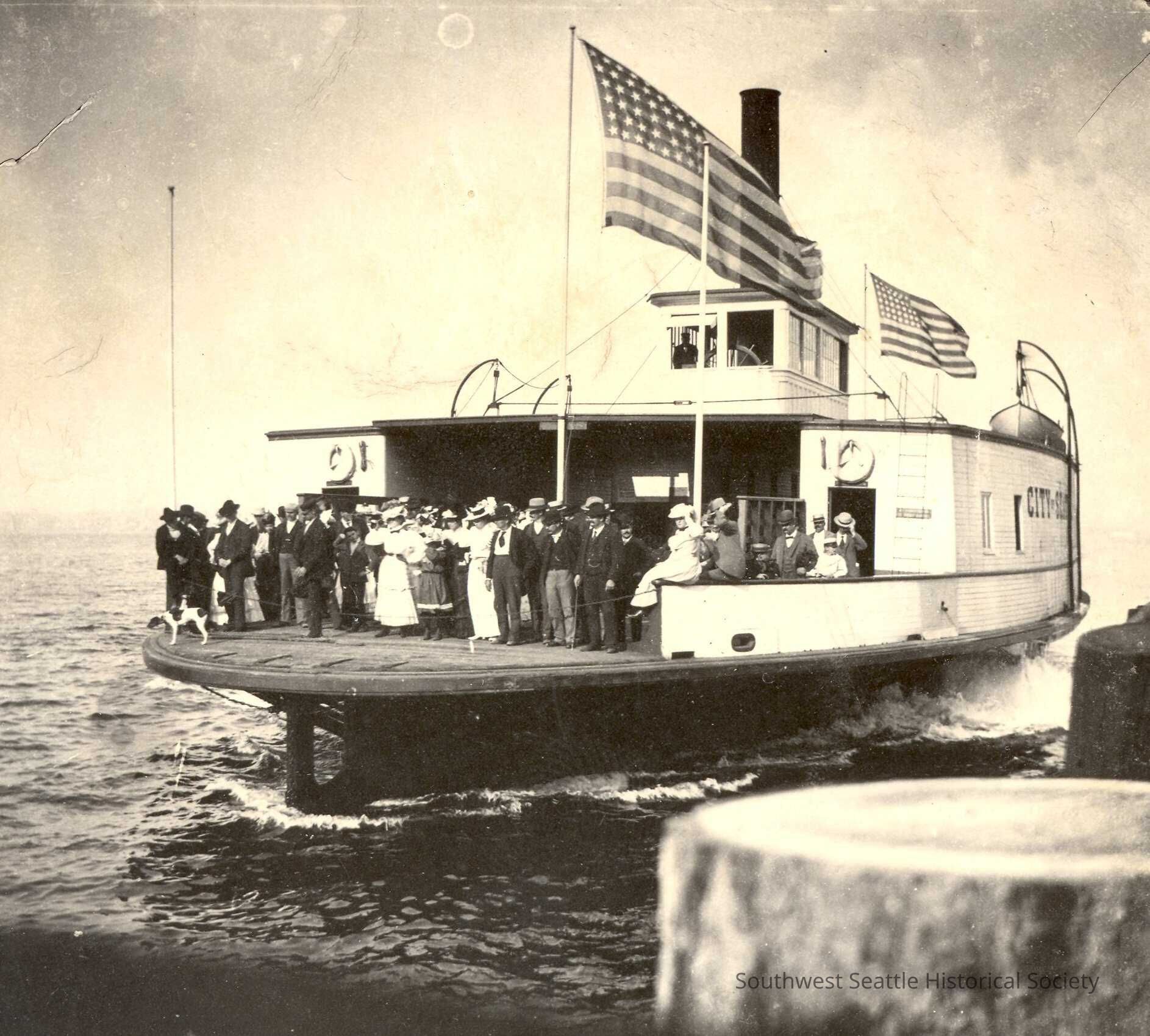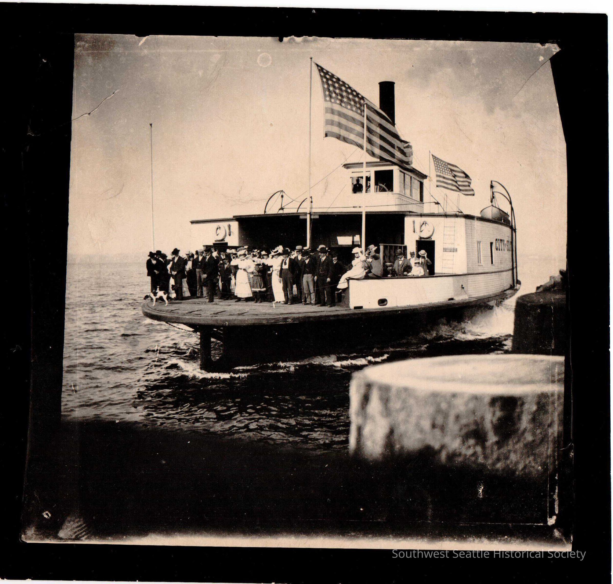 Photo of City of Seattle Ferryboat with group of people on board.